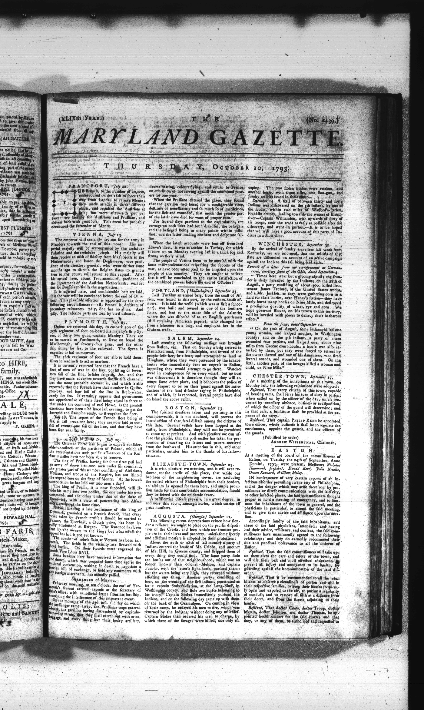 Maryland Gazette Collection (MSA SC 2731) July 5, 1787 - December 25, 1794 M 1284 A Publication of the Archives of Maryland Online Image No: 1431 Enlarge and print image (3M) |