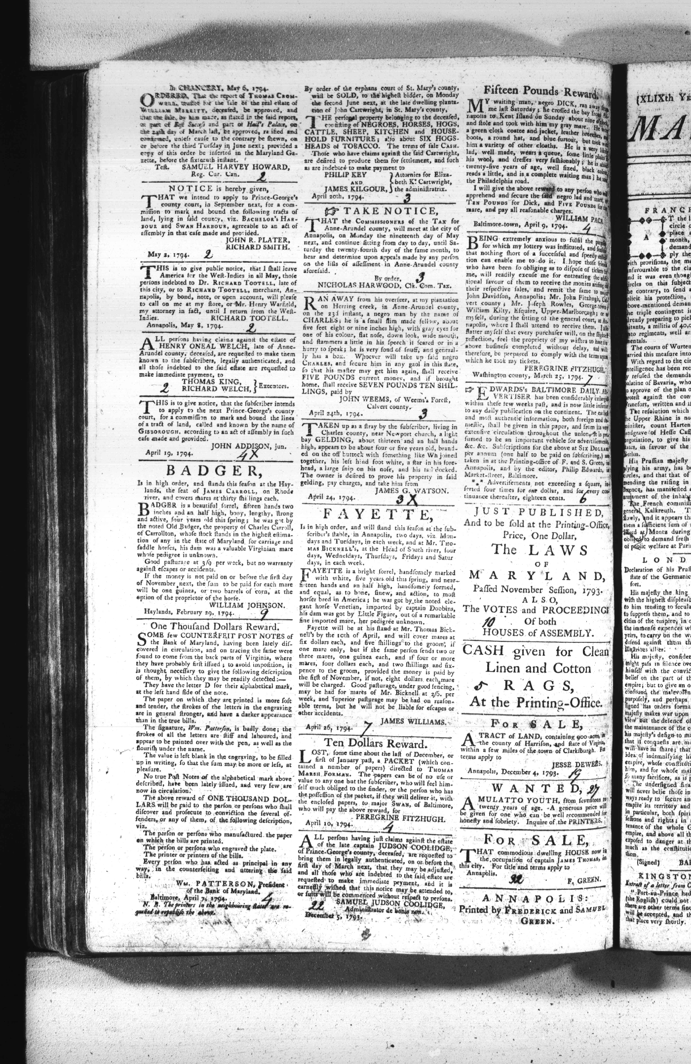 Maryland Gazette Collection (MSA SC 2731) July 5, 1787 - December 25, 1794 M 1284 A Publication of the Archives of Maryland Online Image No: 1566 Enlarge and print image (2M) |