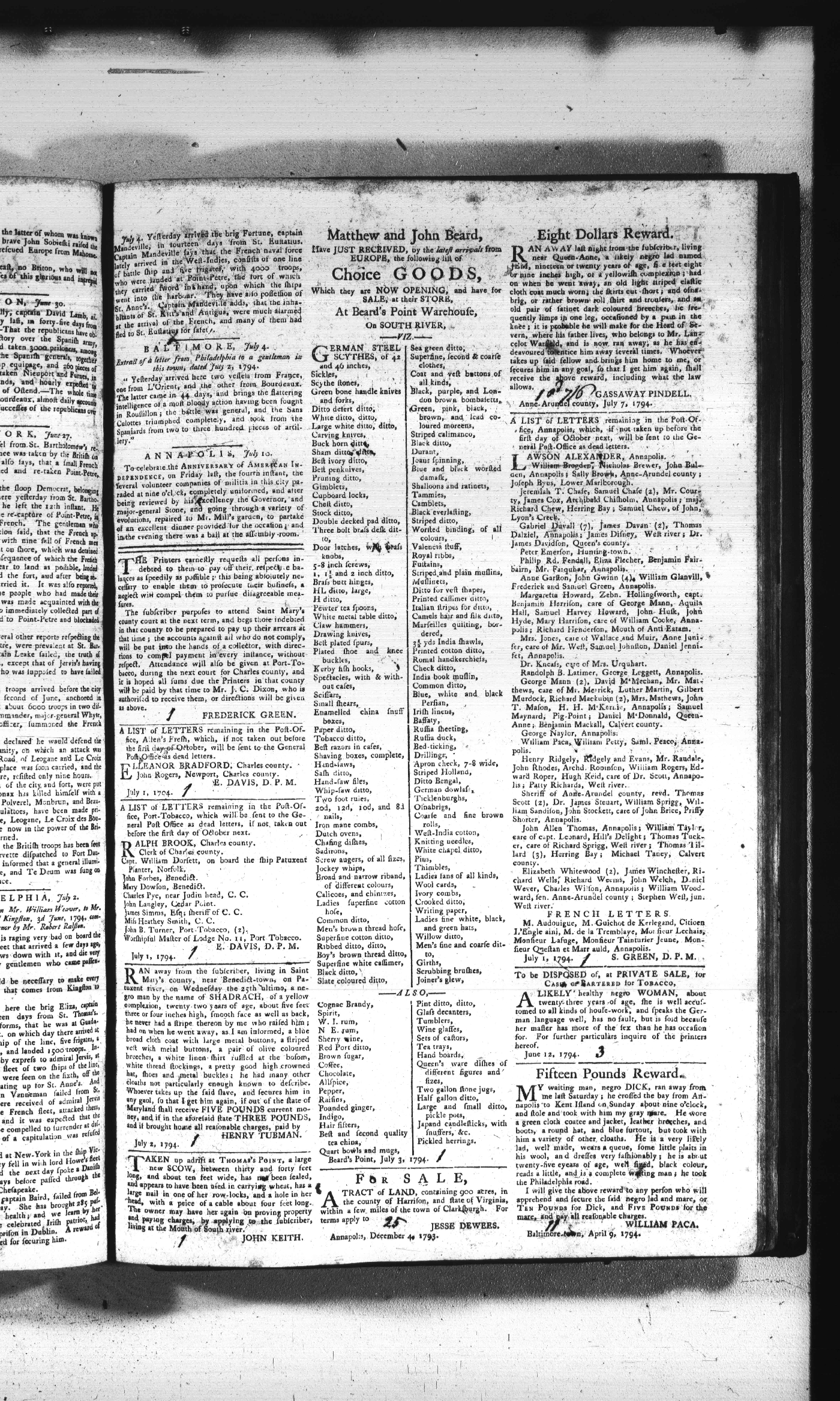 Maryland Gazette Collection (MSA SC 2731) July 5, 1787 - December 25, 1794 M 1284 A Publication of the Archives of Maryland Online Image No: 1605 Enlarge and print image (2M) |