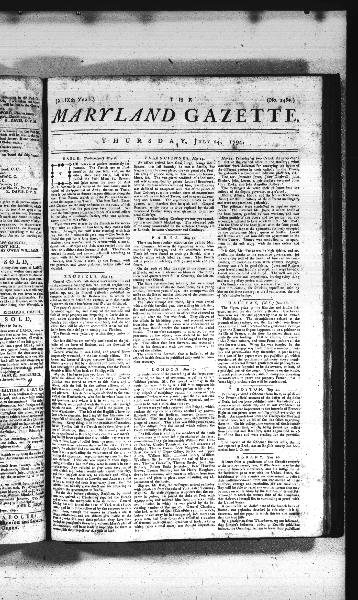 Maryland Gazette Collection (MSA SC 2731) July 5, 1787 - December 25, 1794 M 1284 A Publication of the Archives of Maryland Online Image No: 1611 Enlarge and print image (3M) |