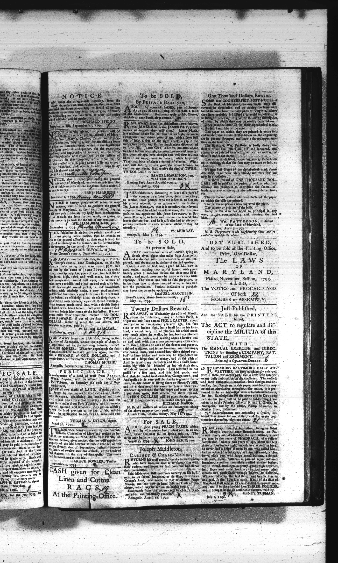 Maryland Gazette Collection (MSA SC 2731) July 5, 1787 - December 25, 1794 M 1284 A Publication of the Archives of Maryland Online Image No: 1647 Enlarge and print image (3M) |
