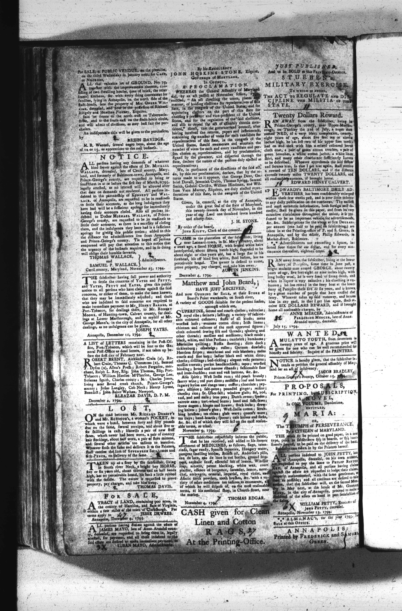Maryland Gazette Collection (MSA SC 2731) July 5, 1787 - December 25, 1794 M 1284 A Publication of the Archives of Maryland Online Image No: 1714 Enlarge and print image (2M) |