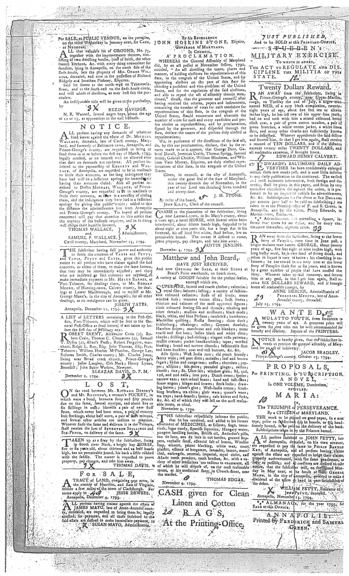 Maryland Gazette Collection MSA SC 2731 January 1, 1795 - December 29, 1803 M 1285 A Publication of the Archives of Maryland Online Image No: 4 Enlarge and print image (3M) |