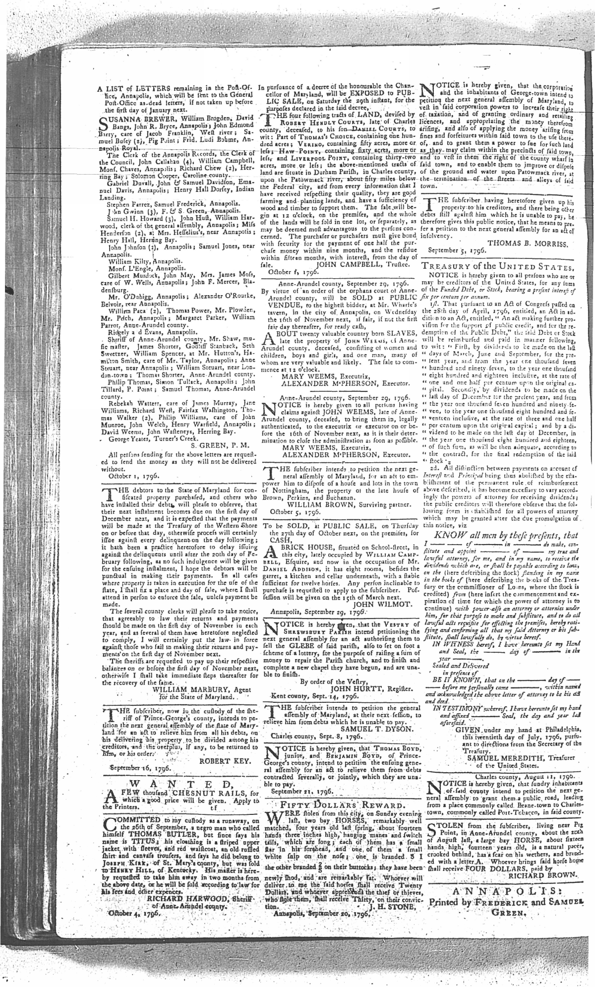Maryland Gazette Collection MSA SC 2731 January 1, 1795 - December 29, 1803 M 1285 A Publication of the Archives of Maryland Online Image No: 388 Enlarge and print image (2M) |