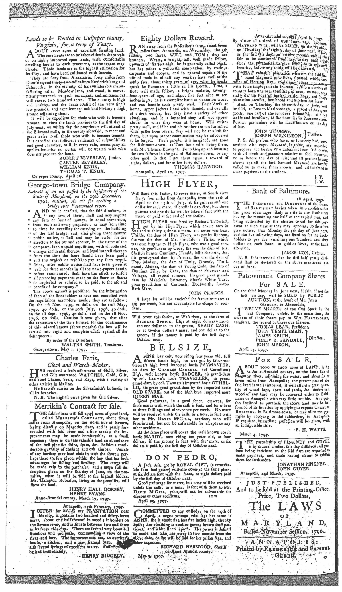 Maryland Gazette Collection MSA SC 2731 January 1, 1795 - December 29, 1803 M 1285 A Publication of the Archives of Maryland Online Image No: 522 Enlarge and print image (2M) |
