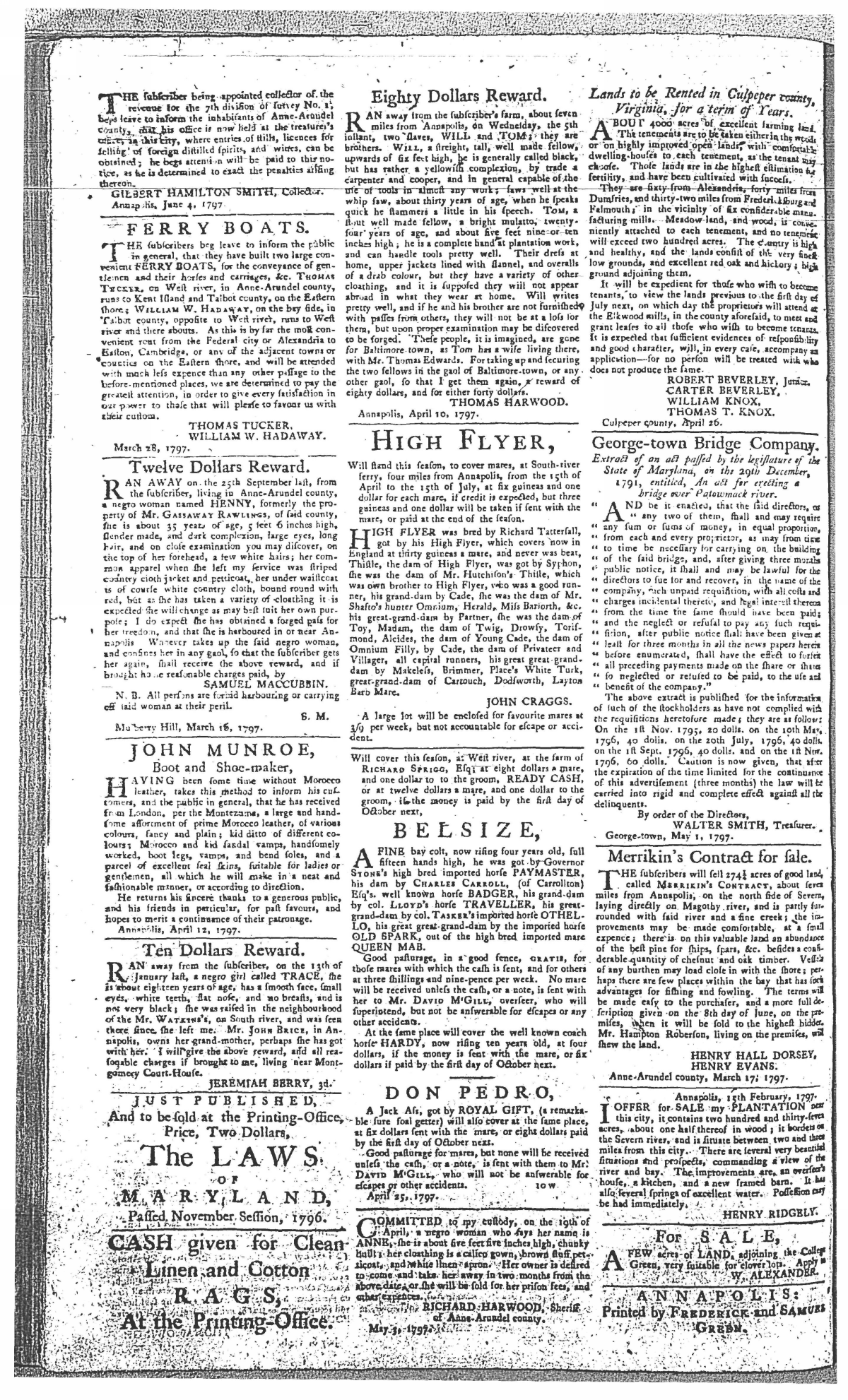 Maryland Gazette Collection MSA SC 2731 January 1, 1795 - December 29, 1803 M 1285 A Publication of the Archives of Maryland Online Image No: 534 Enlarge and print image (3M) |