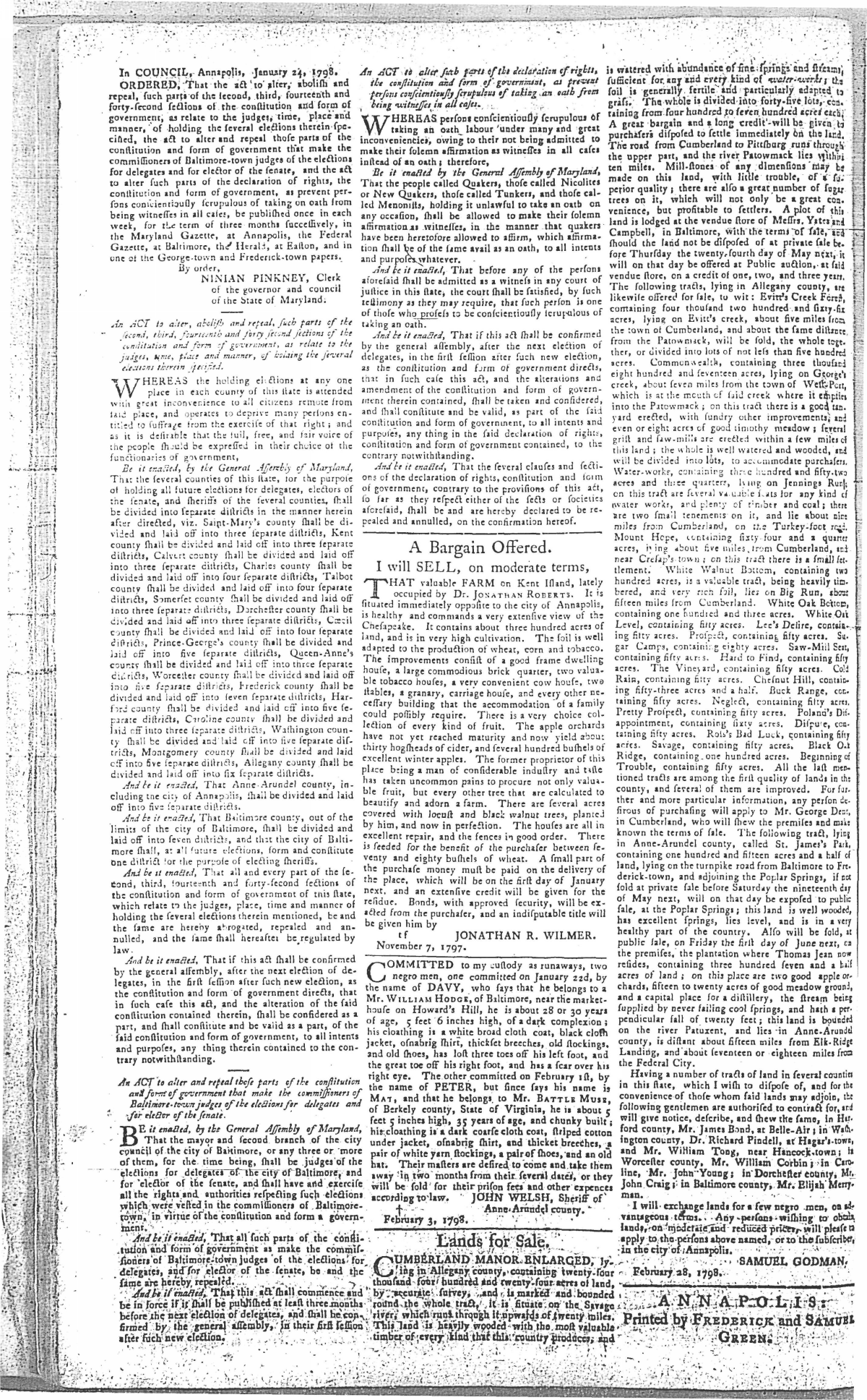 Maryland Gazette Collection MSA SC 2731 January 1, 1795 - December 29, 1803 M 1285 A Publication of the Archives of Maryland Online Image No: 723 Enlarge and print image (3M) |
