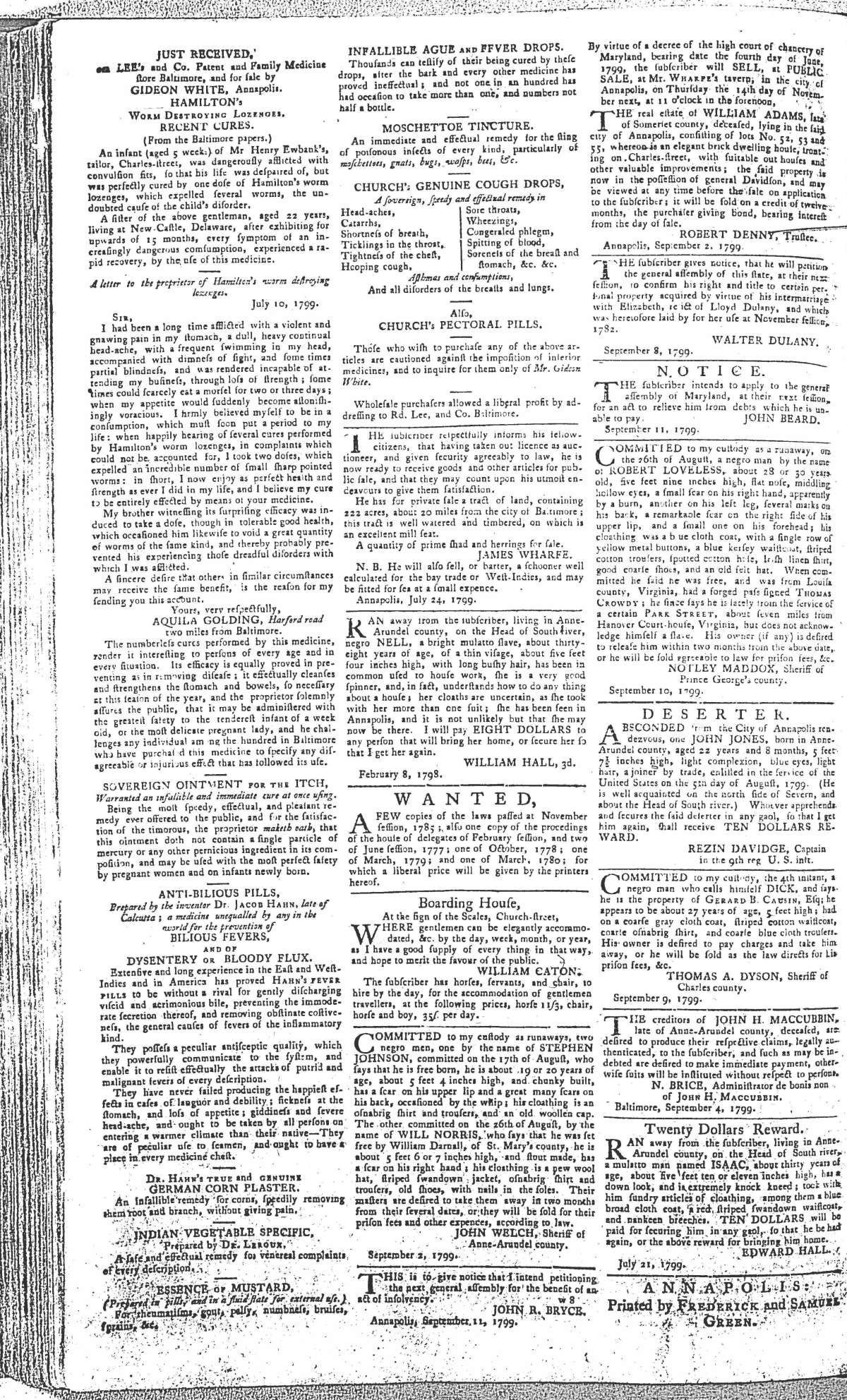 Maryland Gazette Collection MSA SC 2731 January 1, 1795 - December 29, 1803 M 1285 A Publication of the Archives of Maryland Online Image No: 1047 Enlarge and print image (2M) |