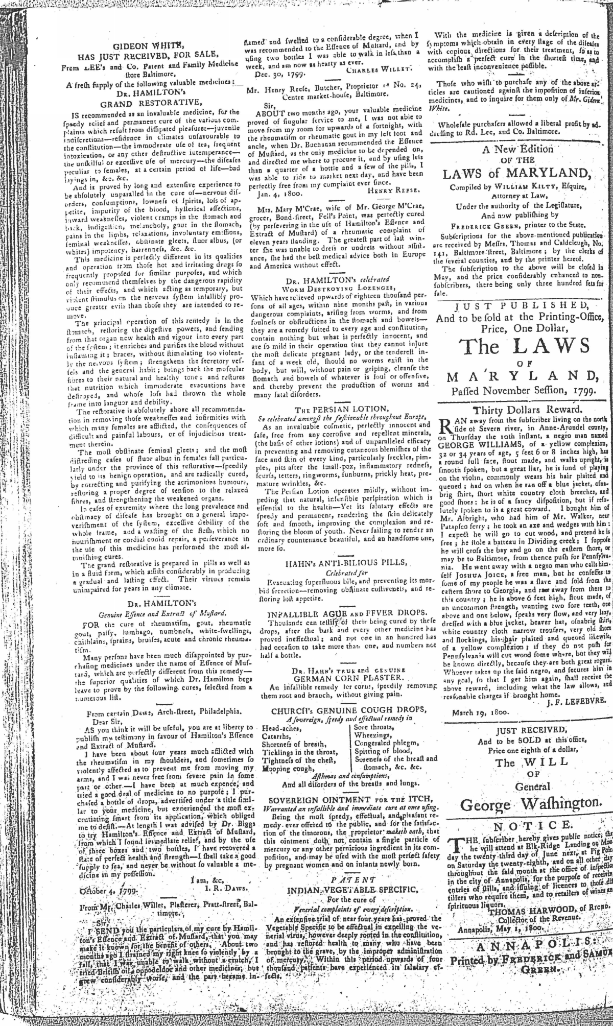 Maryland Gazette Collection MSA SC 2731 January 1, 1795 - December 29, 1803 M 1285 A Publication of the Archives of Maryland Online Image No: 1187 Enlarge and print image (2M) |
