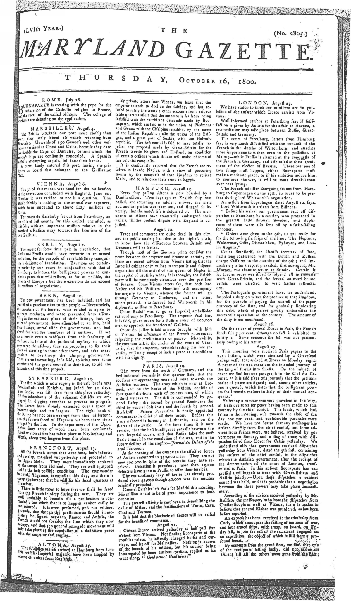 Maryland Gazette Collection MSA SC 2731 January 1, 1795 - December 29, 1803 M 1285 A Publication of the Archives of Maryland Online Image No: 1268 Enlarge and print image (2M) |