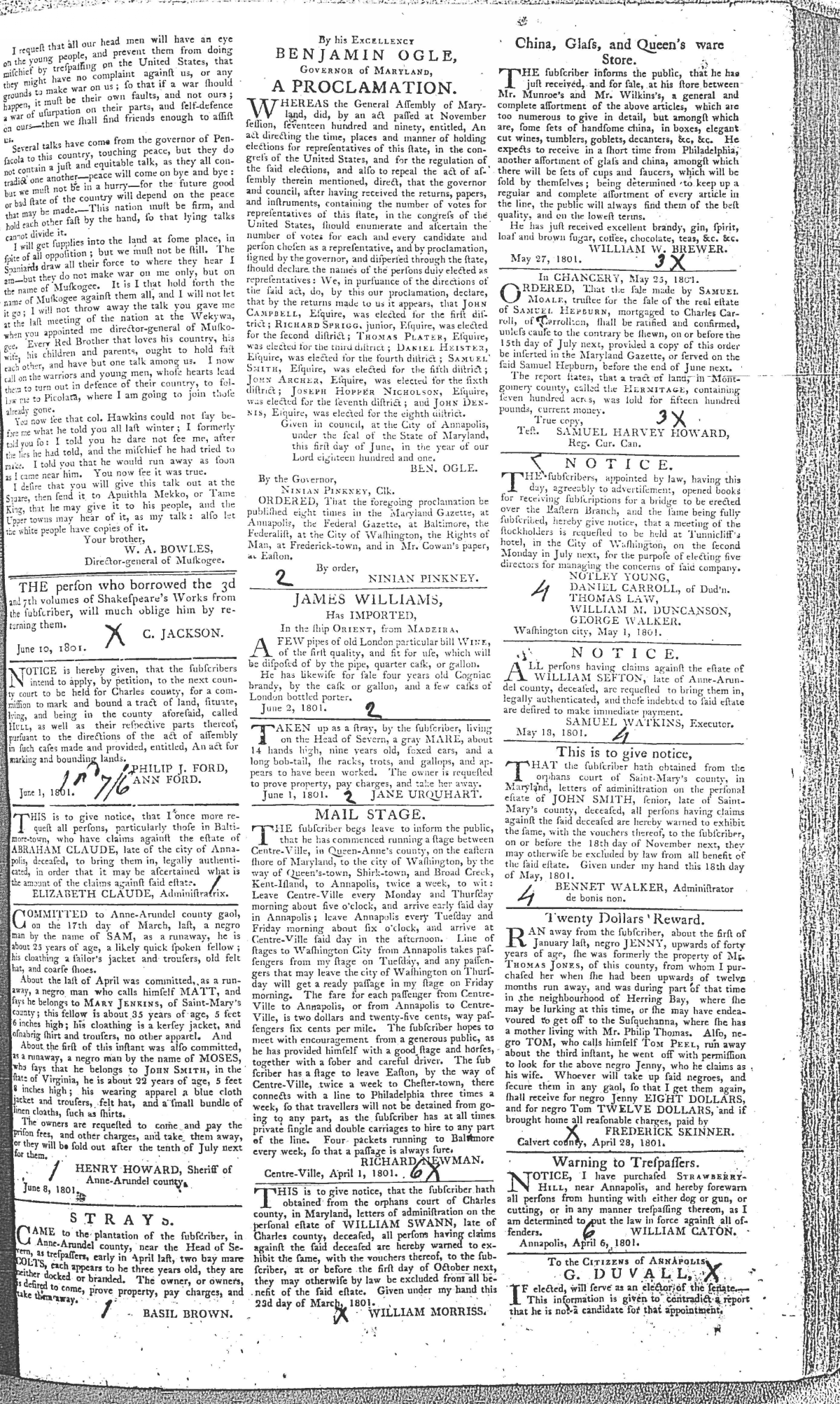 Maryland Gazette Collection MSA SC 2731 January 1, 1795 - December 29, 1803 M 1285 A Publication of the Archives of Maryland Online Image No: 1407 Enlarge and print image (2M) |