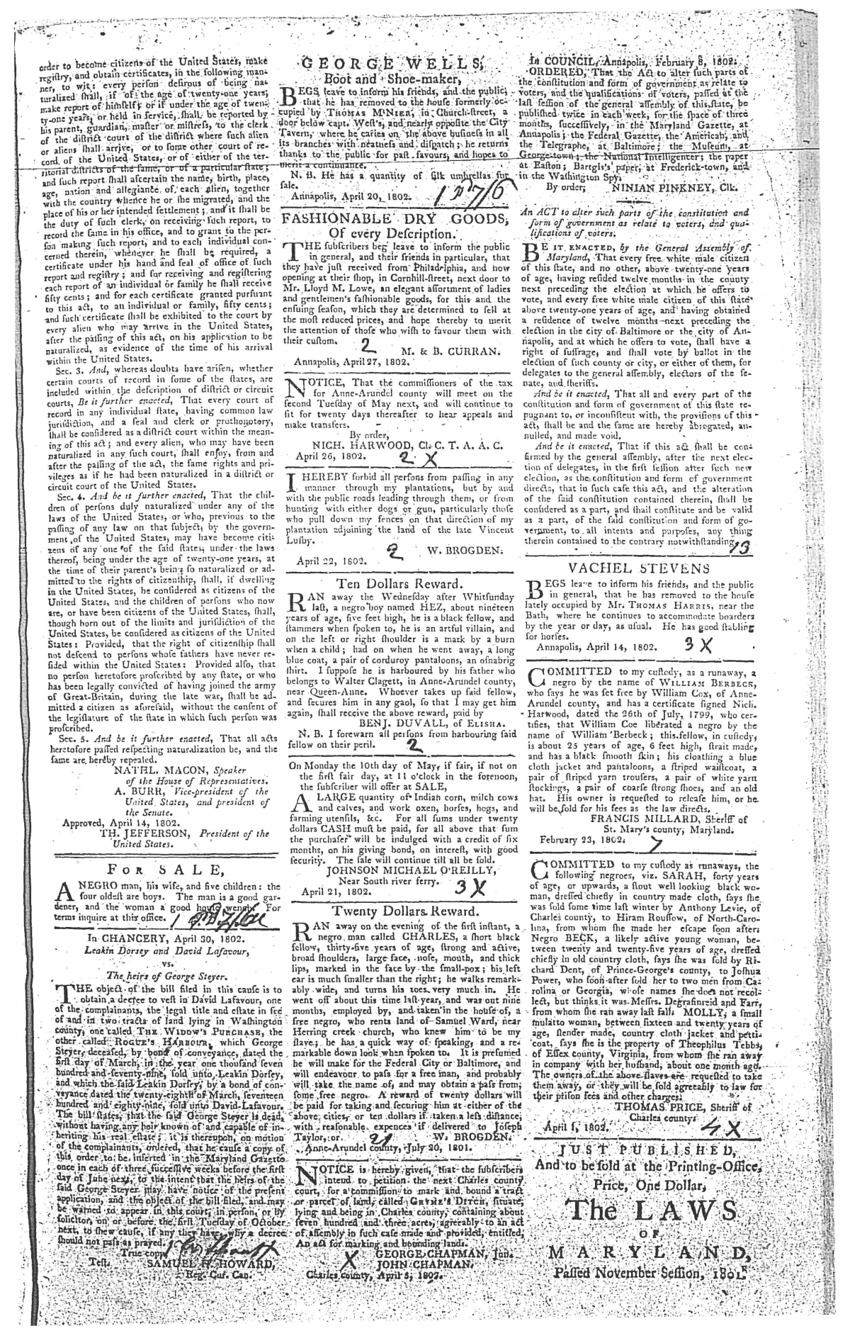 Maryland Gazette Collection MSA SC 2731 January 1, 1795 - December 29, 1803 M 1285 A Publication of the Archives of Maryland Online Image No: 1595 Enlarge and print image (3M) |