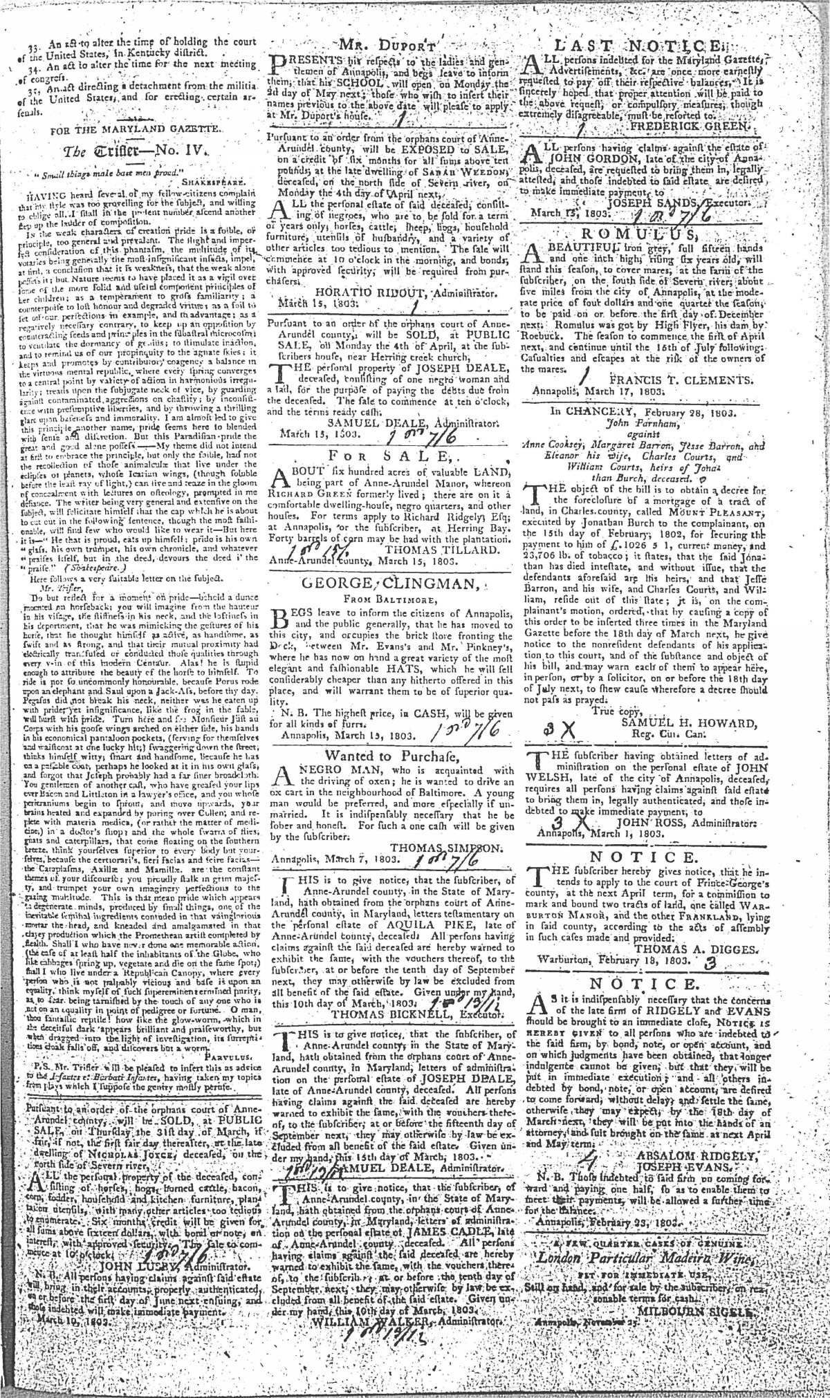 Maryland Gazette Collection MSA SC 2731 January 1, 1795 - December 29, 1803 M 1285 A Publication of the Archives of Maryland Online Image No: 1787 Enlarge and print image (3M) |