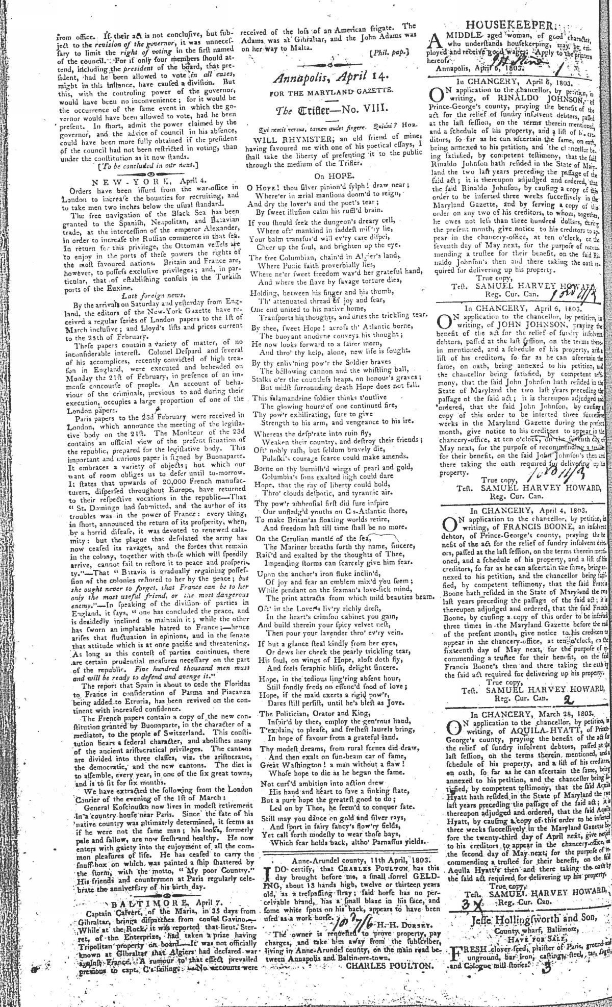 Maryland Gazette Collection MSA SC 2731 January 1, 1795 - December 29, 1803 M 1285 A Publication of the Archives of Maryland Online Image No: 1803 Enlarge and print image (2M) |