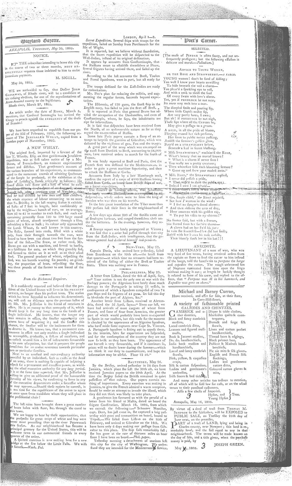 Maryland Gazette Collection MSA SC 2731 January 5, 1804 - December 27, 1810 M 1286 A Publication of the Archives of Maryland Online Image No: 313 Enlarge and print image (2M) |