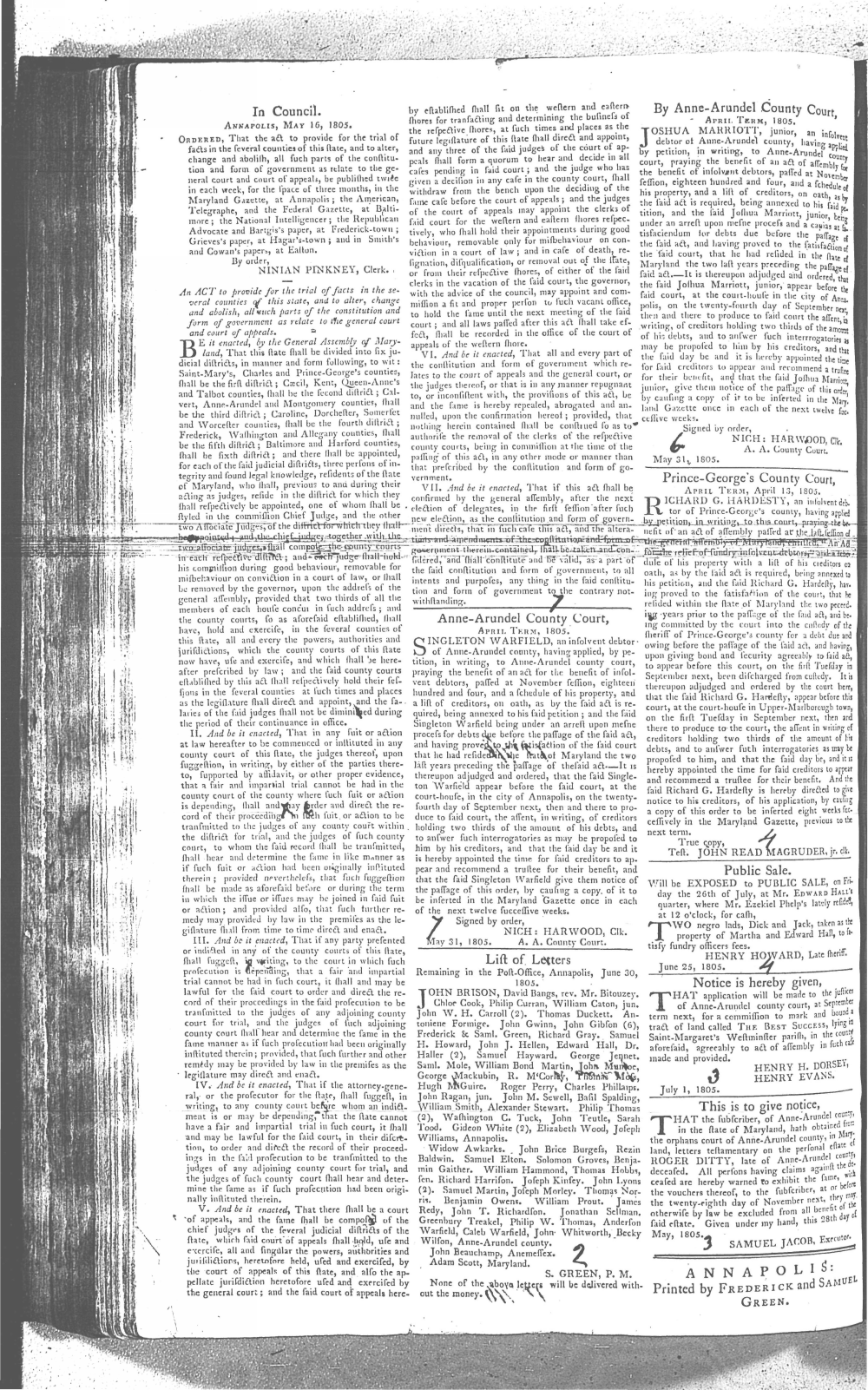 Maryland Gazette Collection MSA SC 2731 January 5, 1804 - December 27, 1810 M 1286 A Publication of the Archives of Maryland Online Image No: 356 Enlarge and print image (3M) |