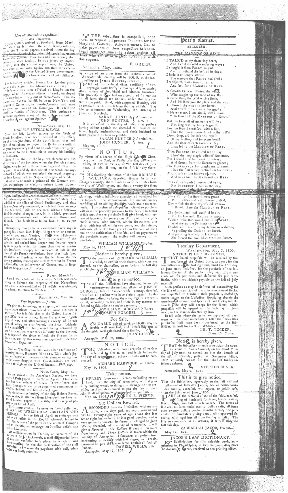 Maryland Gazette Collection MSA SC 2731 January 5, 1804 - December 27, 1810 M 1286 A Publication of the Archives of Maryland Online Image No: 539 Enlarge and print image (2M) |