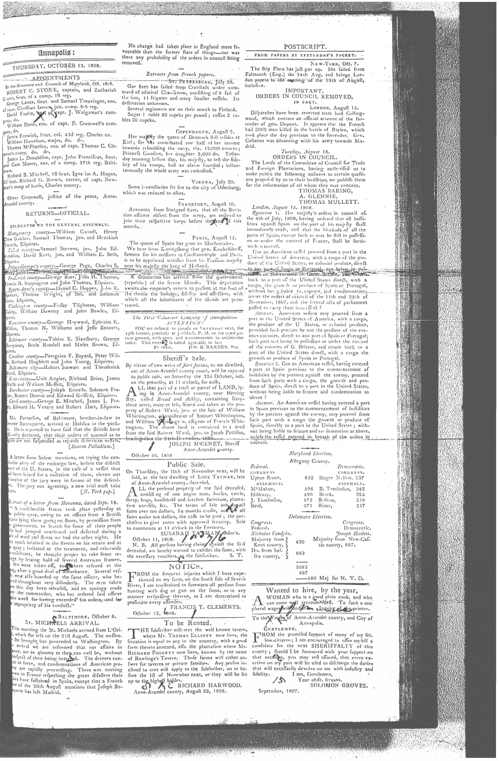 Maryland Gazette Collection MSA SC 2731 January 5, 1804 - December 27, 1810 M 1286 A Publication of the Archives of Maryland Online Image No: 1086 Enlarge and print image (2M) |