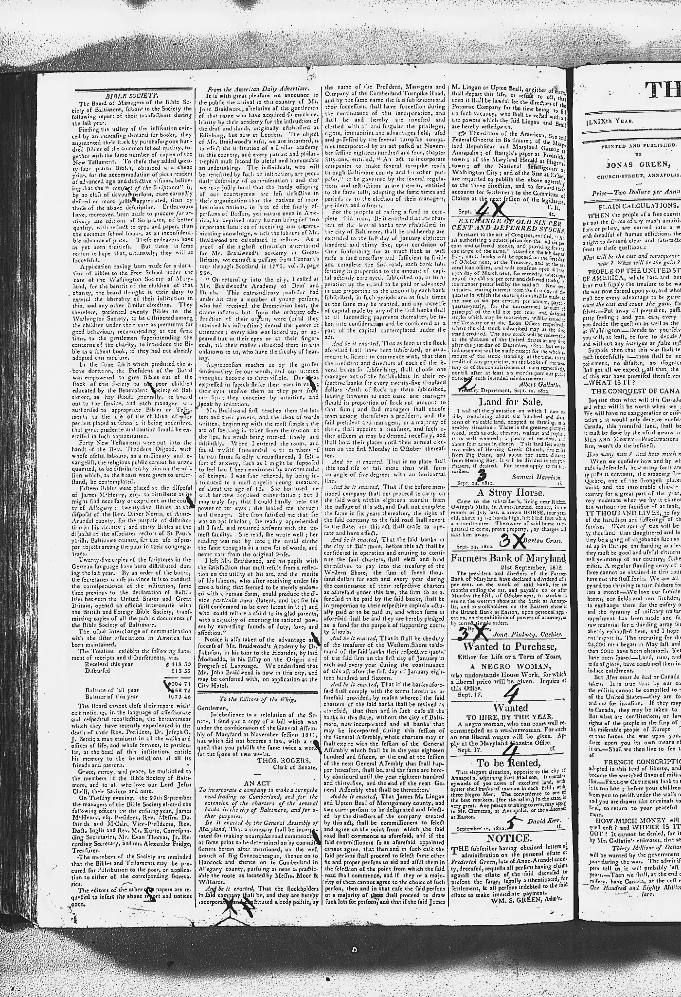 Maryland Gazette and Maryland Gazette and Political Intelligencer Collections MSA SC 2731 and SC 3403 January 2, 1811 - December 19, 1816 M 1287 A Publication of the Archives of Maryland Online Image No: 412