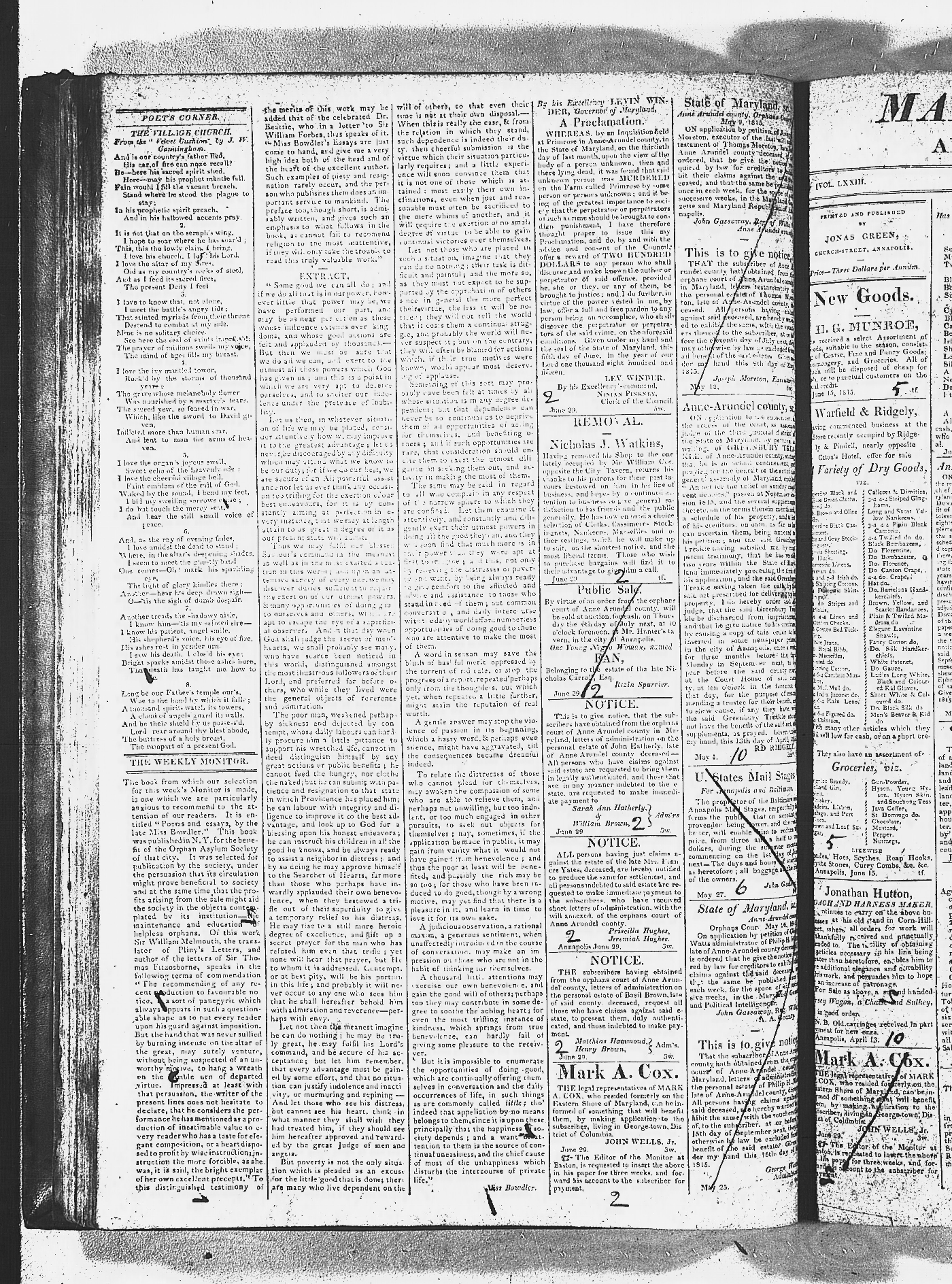 Maryland Gazette and Maryland Gazette and Political Intelligencer Collections MSA SC 2731 and SC 3403 January 2, 1811 - December 19, 1816 M 1287 A Publication of the Archives of Maryland Online Image No: 1068