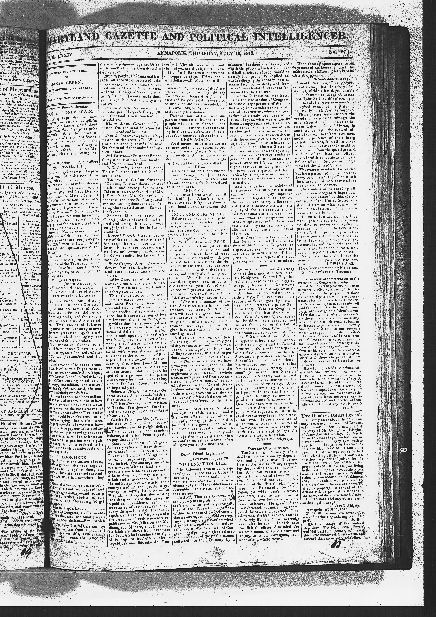 Maryland Gazette and Maryland Gazette and Political Intelligencer Collections MSA SC 2731 and SC 3403 January 2, 1811 - December 19, 1816 M 1287 A Publication of the Archives of Maryland Online Image No: 1314