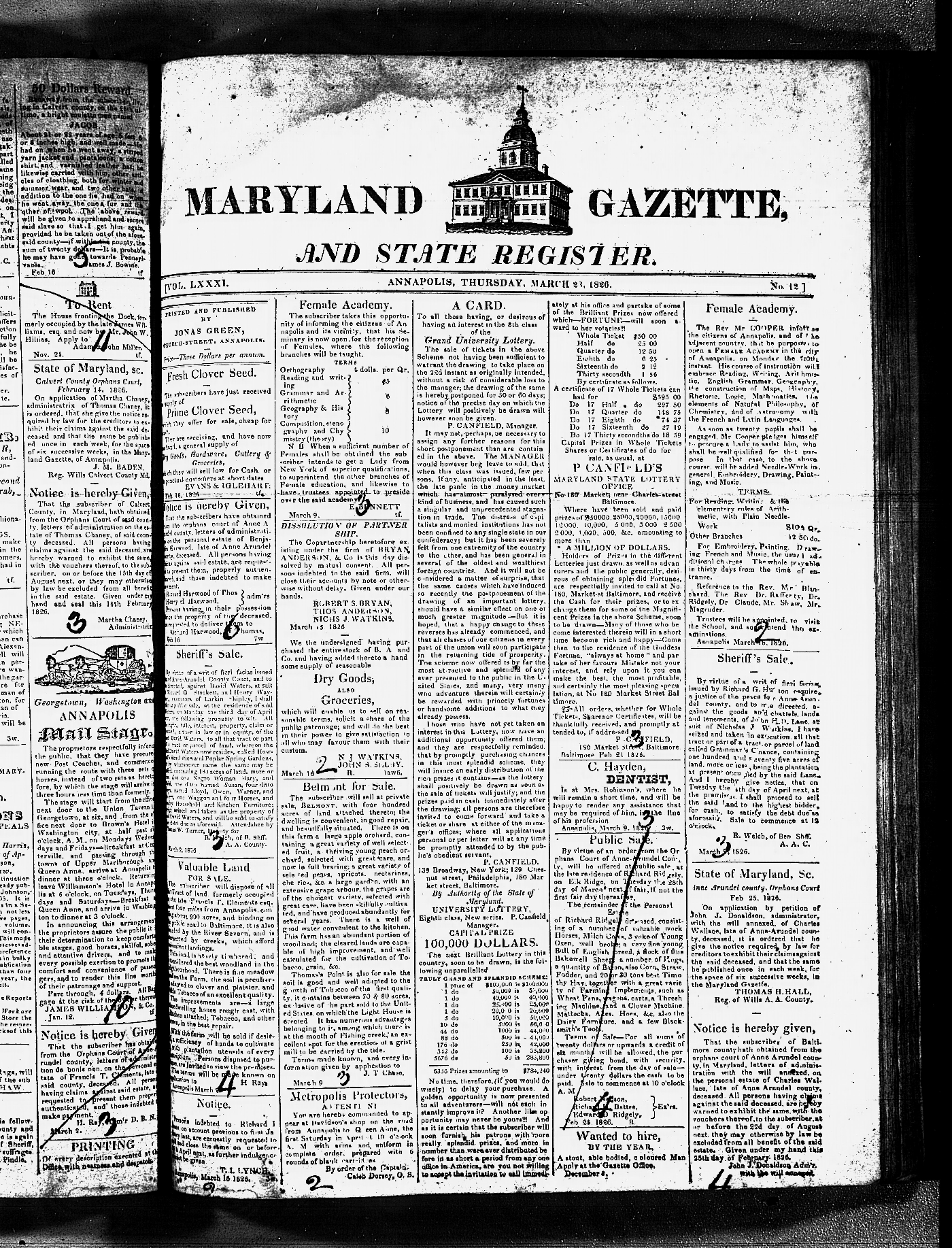 Maryland Gazette and Political Intelligencer and Maryland Gazette and State Register Collections, MSA SC 3403 and SC 3428 January 2, 1823 - December 25, 1828 M 1289 A Publication of the Archives of Maryland Online Image No: 700