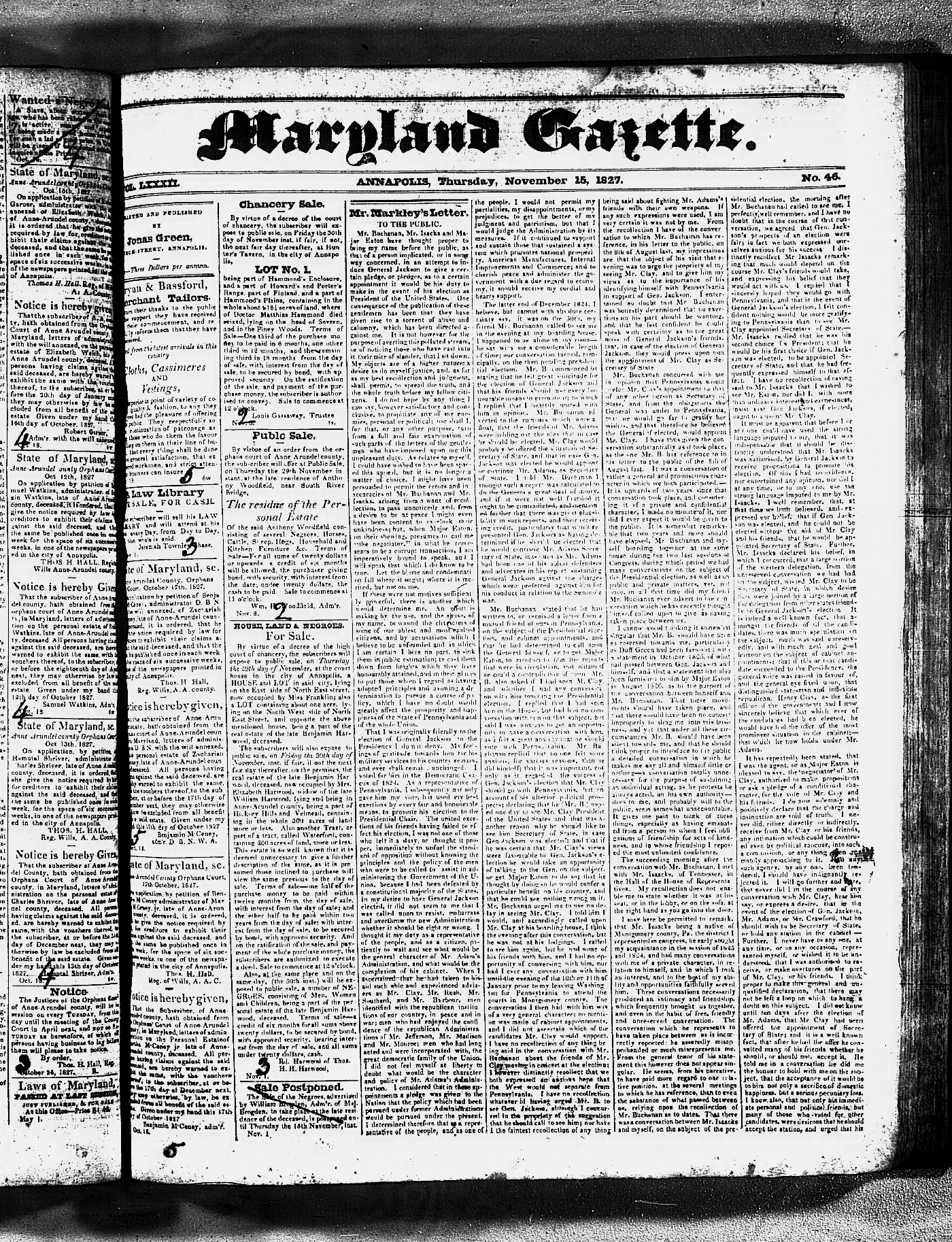 Maryland Gazette and Political Intelligencer and Maryland Gazette and State Register Collections, MSA SC 3403 and SC 3428 January 2, 1823 - December 25, 1828 M 1289 A Publication of the Archives of Maryland Online Image No: 1100