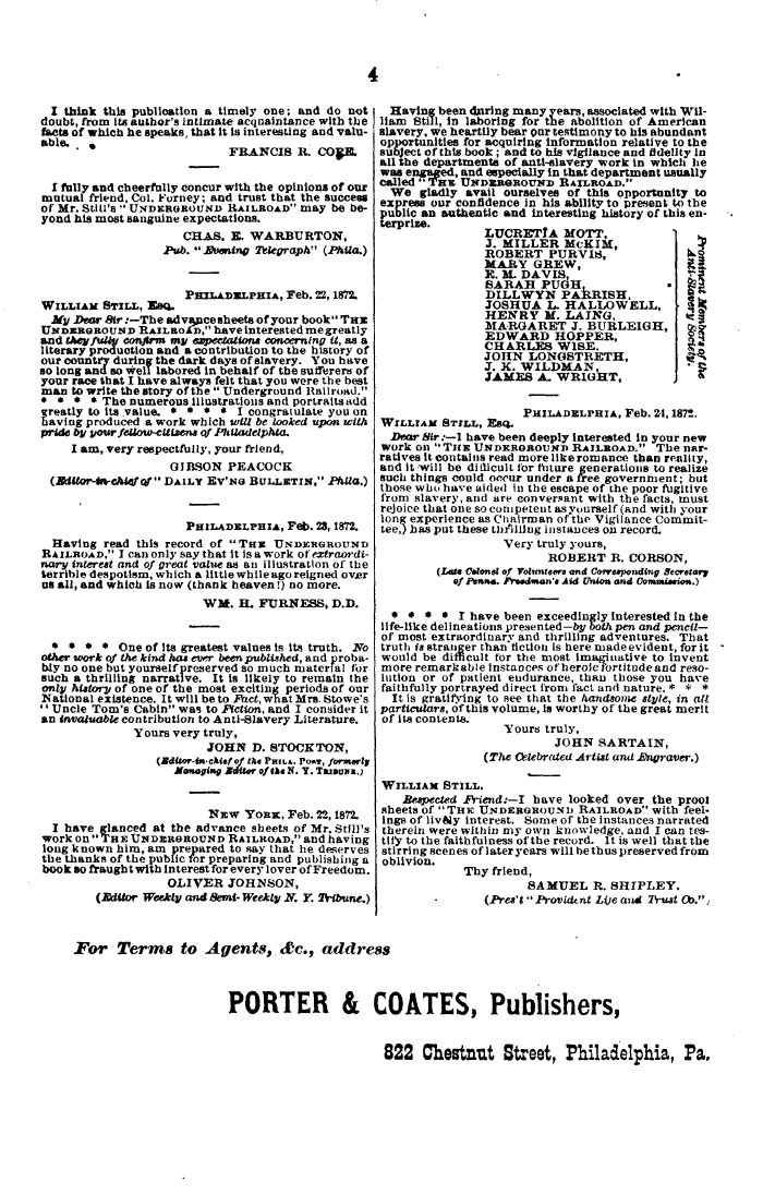 | I think this publication a timely one; and do not doubt, from its author's intimate acquaintance with the facts of which be speaks, that it is interesting and valu- 61 ' * FRANCIS R. COŁK. I fnlly and cheerfully concur with the opinions of OOP mutual friend. Col. Forney; and trust that the success of Mr. Still's " UNDERGROUND RAILROAD" may be beyond his most sanguine expectations. CHAS. B. WARBURTON, Pub. "Evening Telegraph" (Phila.) PHILADELPHIA, Feb. 22,1872. WILLIAM STILL, ESQ. My Dear Mr .'—The advance sheets of your book" THK UNDERGROUND RAILROAD," have interested me greatly and tAcyfulty confirm my expectation* concerning #, as a literary production and a contribution to the history of our country during the dark days of slavery. You have so long and so well labored in behalf of the sufferers of your race that I have always felt that you were the best man to write the story of the " Underground Railroad." * * * * The numerous illustrations and portraits add yreatly to its value. * * * * I congratulate you on having produced a work which will be looked upon with pride by your feUow-tUiaent of Philadelphia. I am, very respectfully, your friend, GJBSON PEACOCK (Xdltor-in-cMefof" DAILY KV'NO BULLETIN," Phlla.) PHILADELPHIA, Feb. 28,1872. Having read this record of "THK UNDERGROUND RAILROAD," I can only say that it is a work of extraordinary interest and of great value as an illustration of the terrible despotism, which a little while ago reigned ovjar as all, and which is now (thank heaven!) no more. WM. H. FURNESS, 0.D. * * * * One of Its greatest values Is Its truth. No other work of the kind hat ever been published, and probably no one but yourself preserved so much material for such a thrilling narrative. It Is likely to remain the only hittory of one of the most exciting periods of our National existence. It will be to Fact, what Mrs. Stowe's " Uncle Tom's Cabin" was to Fiction, and I consider it an invaluable contribution to Anti-Slavery Literature. Yours very truly, JOHN L>. STOCK TON, (SditoT-in-ckief of the PHIL*. POUT, formerly Managing fdttor o/tk« N. T. TKIBCHI.; NKW YORK, Feb. 22,1872. I have glanced at the advance sheets of Mr. Still's work on "THE UNDKR& HOUND RAILROAD," and having long known him, am prepared to say that he deserves the thanks of the public for preparing and publishing a book so fraught with Interest for every lover of Freedom. OLIVER JOHNSON, (Editor Weekly and Semi-Weekly N. Y. Tribune.) Having been during many years, associated with William Still, in laboring for the abolition of American slavery, we heartily bear our testimony to bis abundant opportunities for acquiring information relative to the subject of this book; and to his vigilance and fidelity in all the departments of anti-slavery work in which he was encaged, and especially in that department usually called " THK UNDERGROUND RAILROAD." We gladly avail ourselves of this opportunity to express our confidence in his ability to present to the public an authentic and interesting history of this en-Lerprlze. LUCRETlA MOTT, 1 , J. MILLER McKIM, ? ROBERT PUR VIS, t^S MARY GREW, Ł| K. M. DAVIS, rf SARAH PUGH, « |3 3 DILLWYN PARRISH. | * JOSHUA L, HALLO WELL, I 5 HENRY M. LAING. « § MARGARET J. BURLEIGH, too-EDWARD HOPPER, S 3 CHARLES WISE. SŁ JOHN LONGSTRETH, $^ J. K. WILDMAN. ' S JAMBS A. WR1GHT, * PHILADELPHIA, Feb. 24,1872. WILLIAM STILL, Sso. Dear Sir.-—1 have been deeply interested in your new work on " THK UNDERGROUND RAJ.LHOAD." The narratives it contains read more like romance than reality, and it •will be diilicult tor future generations to realize such things could occur under a free government; but those who have airted in the escape of the poor fugitive from slavery, and are conversant with the facts, must rejoice that one so competent as yourself (and with your long experience as Chairman of the Vigilance Committee,) has put these thrilling instances on record. Very truly yours, ROBERT R. CORSON, (Latt Colonel of Volunteers and Corresponding Secretary o/ Pen**, frttdman't Aid Union and Comnuwton.) * * * * I have been exceedingly interested In the life-like delineations presented—by both pen and pencil— of most extraordinary and thrilling adventures. That truth it stranger than fiction is here made evident, for it • would be difficult for the most Imaginative to invent more remarkable instances of heroic fortitude and resolution or of patient endurance, than those you have faithfully portrayed direct from fact and nature. * * * It is gratifying to see that the handsome styte, in all particulars, of this volume, is worthy of the great merit of its contents. Yours truly, JOHN SARTAIN, (The Celebrated Artist and Engraver.) WILLIAM STILL. JSetpected friend.-—I have looked over the prool sheets of "THK UNDERGROUND RAILROAD" with feelings of livftjy interest. Some of the instances narrated therein were within my own knowledge, and I can testify to the faithfulness of the record, it is well that the stirring scenes of lateryears will be thus preserved from oblivion. Thy friend, SAMUEL R. SHIPLEY. (Pret't "Providtnt Lije aii* Trust Oo.", |