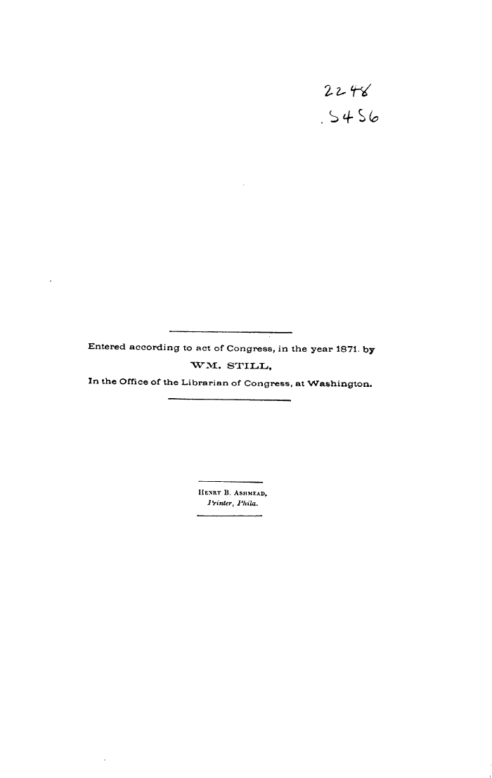 Entered according to act of Congress, in the year 1871. by WM. STILL, In the Office of the Librarian of Congress, at Washington. HENRV B. ASHMEAD, lyinter, 1'lrila.
