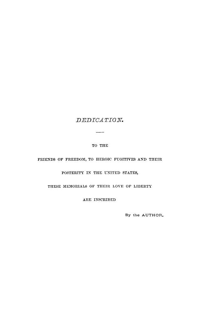 DEDICATION. TO THE FRIENDS OF FREEDOM, TO HEROIC FUGITIVES AND THEIR POSTERITY IN THE UNITED STATES, THESE MEMORIALS OF THEIR LOVE OF LIBERTY ARE INSCRIBED By the AUTHOR.