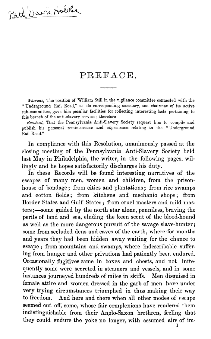 | PREFACE. Whereas, The position of William Still in the vigilance committee connected with the " Underground Rail Road," as its corresponding socretary, and chairman of its active sub-committee, gave him peculiar facilities for collecting interesting fact pertaining to this branch of the anti-slavery service ; therefore Resolved, That the Pennsylvania Anti-Slavery Society request him to compile and publish his personal reminiscence8 and experiences relating to the " Underground Rail Road." In compliance with, this Resolution, unanimously passed at the closing meeting of the Pennsylvania Anti-Slavery Society held last May in Philadelphia, the writer, in the following pages, willingly and he hopes satisfactorily discharges his duty. In these Records will be found interesting narratives of the escapes of many men, women and children, from the prison-house of bondage; from cities and plantations; from rice swamps and cotton fields; from kitchens and mechanic shops; from Border States and Gulf States; from cruel masters and mild mas-ters;—some guided by the north star alone, penniless, braving the perils of land and sea, eluding the keen scent of the blood-hound as well as the more dangerous pursuit of the savage slave-hunter; some from secluded dens and caves of the earth, where for months and years they had been hidden away waiting for the chance to escape; from mountains and swamps, where indescribable suffer-ing from hunger and other privations had patiently been endured. Occasionally fugitives came in boxes and chests, and not infrequently some were secreted in steamers and vessels, and in some instances journeyed hundreds of miles in skiffs. Men disguised in female attire and women dressed in the garb of men have under very trying circumstances triumphed in thus making their way to freedom. And here and there when all other modes of escape seemed cut off, some, whose fair complexions have rendered them indistinguishable from their Anglo-Saxon brethren, feeling that they could endure the yoke no longer, with assumed airs of im- |