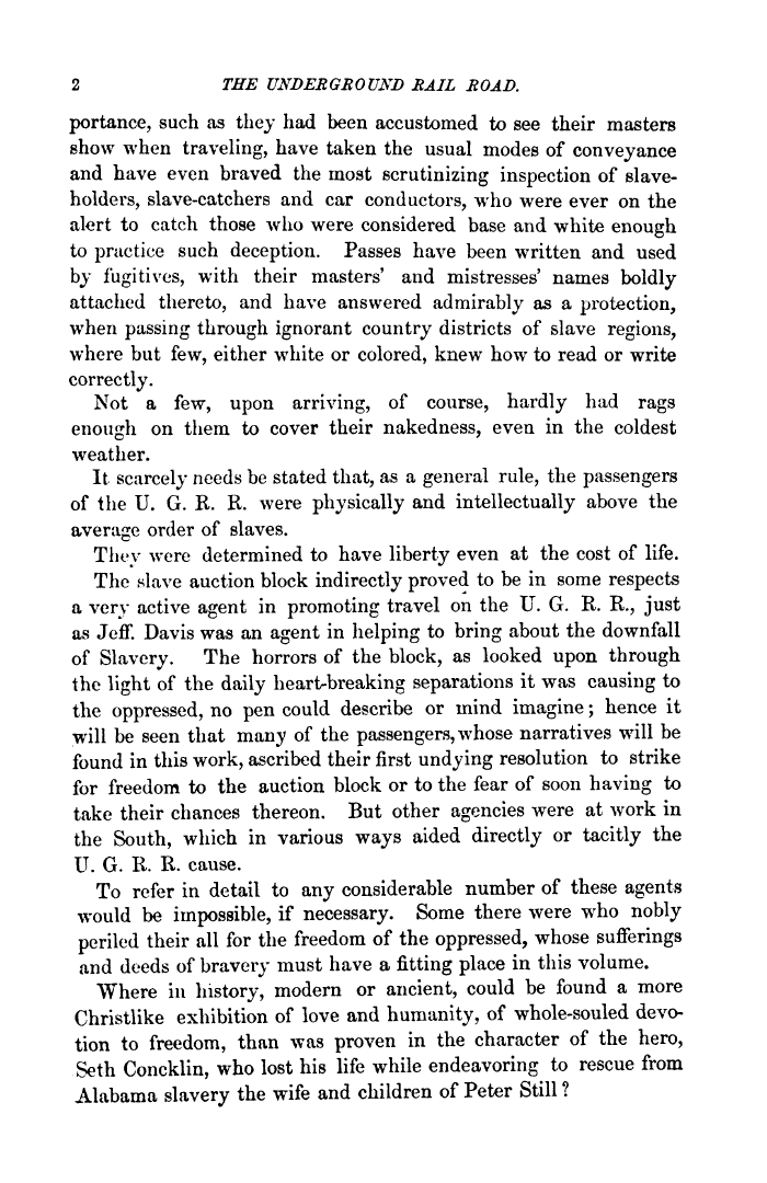 | 2 the undeR gRound Rail Road. portance, such as they had been accustomed to see their master8 show when traveling, have taken the usual modes of conveyance and have even braved the most scrutinizing inspection of 8lave-holders, slave-catchers and car conductors, who were ever on the alert to catch those who were considered base and white enough to pructice such deception. Passes have been written and used by fugitives, with their masters' and mistresses' names boldly attached thereto, and have answered admirably as a protection, when passing through ignorant country districts of slave regions, where but few, either white or colored, knew how to read or write correctly. Not a few, upon arriving, of course, hardly had rags enough on them to cover their nakedness, even in the coldest weather. It scarcely needs be stated that, as a general rule, the passengers of the U. G. R. R. were physically and intellectually above the average order of slaves. They were determined to have liberty even at the cost of life. The slave auction block indirectly proved to be in some respects a very active agent in promoting travel on the U. G. R. R., just as Jeff. Davis was an agent in helping to bring about the downfall of Slavery. The horrors of the block, as looked upon through the light of the daily heart-breaking separations it was causing to the oppressed, no pen could describe or mind imagine; hence it will be seen that many of the passengers, whose narratives will be found in this work, a^scribed their first undying resolution to strike for freedom to the auction block or to the fear of soon having to take their chances thereon. But other agencies were at work in the South, which in various ways aided directly or tacitly the U. G. R. R. cause. To refer in detail to any considerable number of these agents would be impossible, if necessary. Some there were who nobly periled their all for the freedom of the oppressed, whose sufferings and deeds of bravery must have a fitting place in this volume. Where iu h^ory, modern or ancient, could be found a more Christlike exhibition of love and humanity, of whole-souled devo-tion to freedom, than was proven in the character of the hero, Seth Concklin, who lost his life while endeavoring to rescue from Alabama slavery the wife and children of Peter Still ? |
