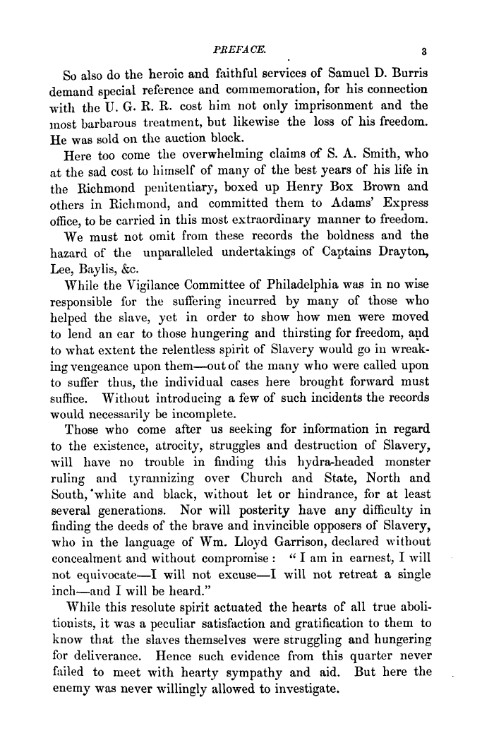 | PREFACE. 3 So also do the heroic and faithful services of Samuel D. Burris demand special reference and commemoration, for his connection with the U. G. R. R. cost him not only imprisonment and the most barbarous treatment, but likewise the loss of his freedom. He was sold on the auction block. Here too come the overwhelming claims of S. A. Smith, who at the sad cost to himself of many of the best years of his life in the Richmond penitentiary, boxed up Henry Box Brown and others in Richmond, and committed them to Adams' Express office, to be carried in this most extraordinary manner to freedom. We must not omit from these records the boldness and the hazard of the unparalleled undertakings of Captains Drayton, Lee, Baylis, &c. While the Vigilance Committee of Philadelphia was in no wise responsible for the suffering incurred by many of those who helped the slave, yet in order to show how men were moved to lend an ear to those hungering and thirsting for freedom, and to what extent the relentless spirit of Slavery would go in wreaking vengeance upon them—out of the many who were called upon to suffer thus, the individual cases here brought forward must suffice. Without introducing a few of such incidents the records would necessarily be incomplete. Those who come after us seeking for information in regard to the existence, atrocity, struggles and destruction of Slavery, will have no trouble in finding this hydra-headed monster ruling and tyrannizing over Church and State, North and South, "white and black, without let or hindrance, for at least several generations. Nor will posterity have any difficulty in finding the deeds of the brave and invincible opposers of Slavery, who in the language of Wm. Lloyd Garrison, declared without concealment and without compromise : " I am in earnest, I will not equivocate—I will not excuse—I will not retreat a single inch—and I will be heard." While this resolute spirit actuated the hearts of all true abolitionists, it was a peculiar satisfaction and gratification to them to know that the slaves themselves were struggling and hungering for deliverance. Hence such evidence from this quarter never failed to meet with hearty sympathy and aid. But here the enemy was never willingly allowed to investigate. |