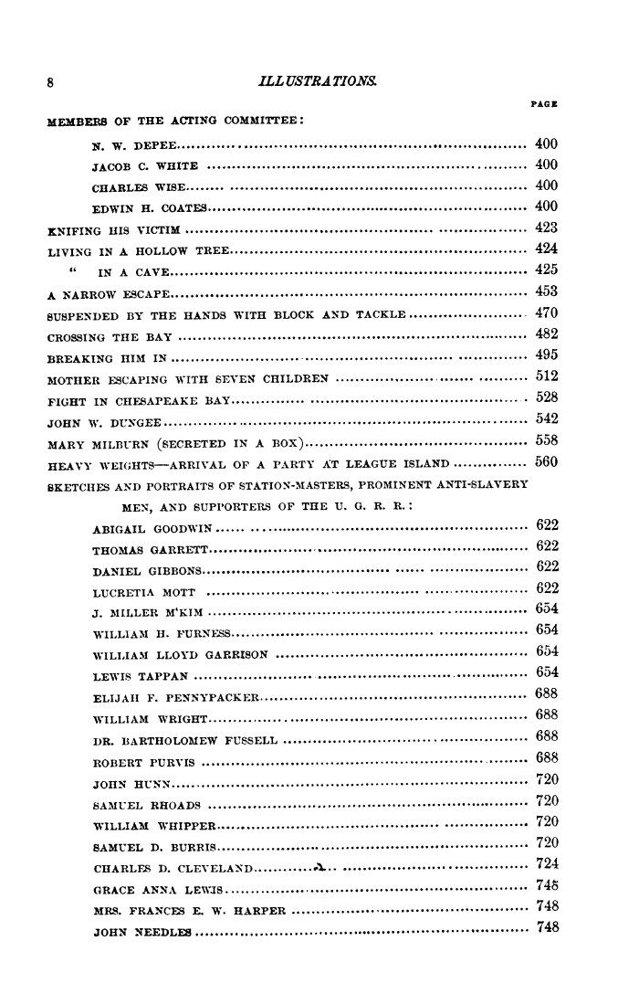 | 8 ILLUSTRATIONS. PAGE MEMBERS OP THE ACTING COMMITTEE: jr. w. DEPEE...................................................................... 400 JACOB C. WHITE ................................................................ 400 CHARLES WISE........ ............................................................ 400 EDWIN H. COATES................................................................. 400 KNIFING HIS VICTIM .................................................. .................. 423 LIVING IN A HOLLOW TREE............................................................ 424 " IN A CAVE........................................................................ 425 A NARROW ESCAPE........................................................................ 453 SUSPENDED BY THE HANDS WITH BLOCK AND TACKLE ....................... 470 CROSSING THE BAY ....................................................................... 482 BREAKING HIM IN ........................................................ .............. 495 MOTHER ESCAPING WITH SEVEN CHILDREN ............................ .......... 512 FIGHT IN CHESAPEAKE BAY............... ........................................... 528 JOHN W. DUXGEE............... .......................................................... 542 MARY MILBURN (SECRETED IN A BOX)............................................. 558 HEAVY WEIGHTS—ARRIVAL OP A PARTY AT LEAGUE ISLAND ............... 560 SKETCHES AND PORTRAITS OF STATION-MASTERS, PROMINENT ANTI-SLAVERY MEN, AND SUPPORTERS OF THE U. G. R. R. : ABIGAIL GOODWIN...... ........................................................ 622 THOMAS GARRETT................................................................ 622 DANIEL GIBBONS...................................... ...... .................... 622 LUCRETIA MOTT ........................................... ..................... 622 J. MILLER M'KIM ................................................................ 654 WILLIAM H. FURNESS......................................... .................. 654 WILLIAM LLOYD GARRISON ................................................... 654 LEWIS TAPPAN .................................................................. 654 ELIJAH F. FENNYPACKER...................................................... 688 WILLIAM WEIGHT................................................................ 688 DR. BARTHOLOMEW FUSSELL ................................................. 688 ROBERT PURVIS ................................................................. 688 JOHN HUNN........................................................................ 720 SAMUEL RHOADS ................................................................. 720 WILLIAM WHIPPER............................................. ................. 720 SAMUEL D. BURRIS............................................................... 720 CHARLES D. CLEVELAND............A... ..................................... 724 GRACE ANNA LEWIS............................................................. 748 MRS. FRANCES E. W. HARPER ................................................ 748 JOHN NEEDLES .................................................................... 748 |