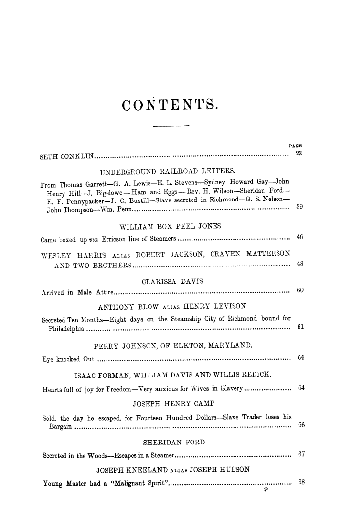 | CONTENTS. PAGE SETHCONKLIN....................................................................................... 23 UNDERGROUND RAILROAD LETTERS. From Thomas Garrett—G. A. Lewis—E. L. Stevens—Sydney Howard Gay—John Henry Hill—J. Bigelowe — Ham and Eggs — Rev. H. Wilson—Sheridan Ford— E. F. Pennypacker—J. C. Bustill—Slave secreted in Richmond—G. S. Nelson— John Thompson—Wm. Penn....................................................................... 39 WILLIAM BOX PEEL JONES Came boxed up via Erricson line of Steamers ................................................... 46 WESLEY HARRIS ALIAS ROBERT JACKSON, CRAVEN MATTERSON AND TWO BROTHERS....................................................................... 48 CLARISSA DAVIS Arrived in Male Attire............................................................................... 60 ANTHONY BLOW ALIAS HENRY LEVISON Secreted Ten Months—Eight days on the Steamship City of Richmond bound for Philadelphia............ ................................................................................ 61 PERRY JOHNSON, OF ELKTON, MARYLAND. Eye knocked Out ....................................................................................... 64 ISAAC FORMAN, WILLIAM DAVIS AND WILLIS REDICK. Hearts full of joy for Freedom—Very anxious for Wives in Slavery...................... 64 JOSEPH HENRY CAMP Sold, the day he escaped, for Fourteen Hundred Dollars—Slave Trader loses his Bargain .................................................................................................. 66 SHERIDAN FORD Secreted in the Woods—Escapes in a Steamer..................................................... 67 JOSEPH KNEELAND ALIAS JOSEPH HULSON Young Master had a "Malignant Spirit"........................................................ 68 |