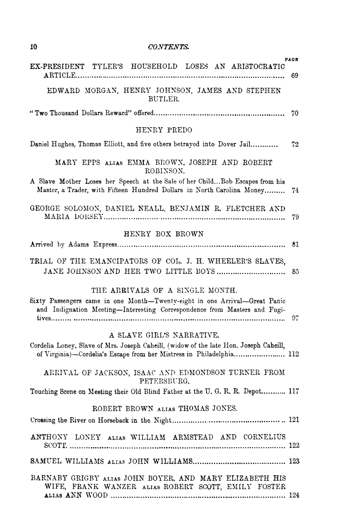 | 10 CONTENTS. PACK EX-PRESIDENT TYLER'S HOUSEHOLD LOSES AN ARISTOCRATIC ARTICLE............................................................................................ 69 EDWARD MORGAN, HENRY JOHNSON, JAMES AND STEPHEN BUTLER. " Two Thousand Dollars Reward" offered......................................................... 70 HENRY PREDO Daniel Hughes, Thomas Elliott, and five others betrayed into Dover Jail............ 72 MARY EPPS ALIAS EMMA BROWN, JOSEPH AND ROBERT ROBINSON. A Slave Mother Loses her Speech at the Sale of her Child...Bob Escapes from his Master, a Trader, with Fifteen Hundred Dollars in Korth Carolina Money......... 74 GEORGE SOLOMON, DANIEL NEALL, BENJAMIN R. FLETCHER AND MARIA UOKSEY................................................................................ 79 HENRY BOX BROWN Arrived by Adams Express.......................................................................... 81 TRIAL OF THE EMANCIPATORS OF COL. J. H. WHEELER'S SLAVES, JANE JOHNSON AND HER TWO LITTLE BOYS.............................. 85 THE ARRIVALS OF A SINGLE MONTH. Sixty Passengers came in one Month—Twenty-eight in one Arrival—Great Panic and Indignation Meeting—Interesting Correspondence from Masters and Fugitives......... ............................................................................................. 97 A SLAVE GIRL'S NARRATIVE. Cordelia Loney, Slave of Mrs. Joseph Caheill, (widow of the late Hon. Joseph Caheill, of Virginia)—Cordelia's Escape from her Mistress in Philadelphia....................... 112 ARRIVAL OF JACKSON, ISAAC AND EDMONDSON TURNER FROM PETERSBURG. Touching Scene on Meeting their Old Blind Father at the U. G. R. R. Depot........... 117 ROBERT BROWN ALIAS THOMAS JONES. Crossing the River on Horseback in the Night................................................. 121 ANTHONY LONEY ALIAS WILLIAM ARMSTEAD AND CORNELIUS SCOTT. ............................................................................................... 122 SAMUEL WILLIAMS ALIAS JOHN WILLIAMS......................................... 123 BARNABY GRIGBY ALIAS JOHN BOYER, AND MARY ELIZABETH HIS WIFE, FRANK WANZER ALIAS ROBERT SCOTT, EMILY FOSTER ALIAS ANN WOOD ............................................................................. 124 |