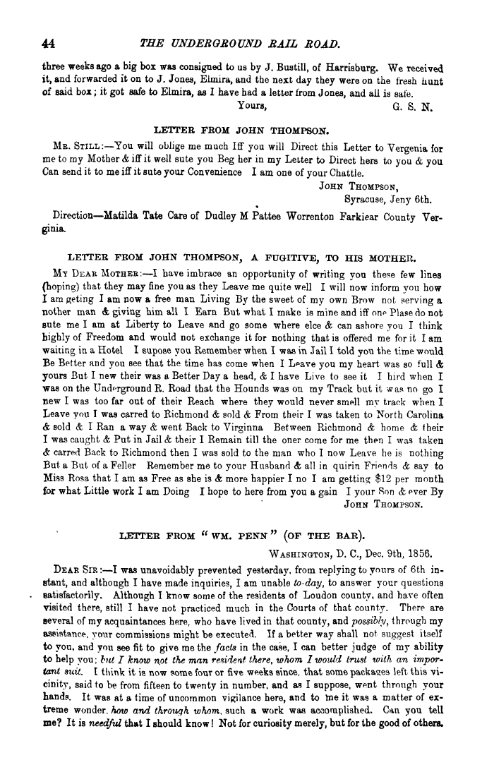 | 44 THE UNDERGROUND RAIL ROAD. three weeks ago a big box was consigned to us by J. Bustill, of Harrisburg. We received it, and forwarded it on to J. Jones, Elmira, and the next day they were on the fresh hunt of said box; it got safe to Elmira, as I have had a letter from Jones, and all is safe. Yours, G. S. N. LETTER FBOM JOHN THOMPSON. ME. STILL:—You will oblige me much Iff you will Direct this Letter to Vergenia for me to my Mother & iff it well sute you Beg her in my Letter to Direct hers to you & you Can send it to me iff it sute your Convenience I am one of your Chattle. JOHN THOMPSON, Syracuse, Jeny 6th. * Direction—Matilda Tate Care of Dudley M Pattee Worrenton Farkiear County Ver-ginia. LETTER FROM JOHN THOMPSON, A FUGITIVE, TO HIS MOTHER. MT DEAR MOTHEB:—I have imbrace an opportunity of writing you these few lines (hoping) that they may fine you as they Leave me quite well I will now inform you how I am geting I am now a free man Living By the sweet of my own Brow not serving a nother man & giving him all I Earn But what I make is mine and iff on^ Plase do not Bute me I am at Liberty to Leave and go some where elce & can ashore you I think highly of Freedom and would not exchange it for nothing that is offered me for it I am waiting in a Hotel I supose you Remember vrhen I was in Jail I told you the time would Be Better and you see that the time has come when I L^ave you my heart was so full & yours But I new their was a Better Day a head, & I have Live to see it I hird when I was on the Underground R. Road that the Hounds was on my Track but it w as no go I new I was too far out of their Reach where they would never smell my track when I Leave you I was carred to Richmond & sold & From their I was taken to North Carolina & sold & I Ran a way & went Back to Virginna Between Richmond & home & their I was caught & Put in Jail & their I Remain till the oner come for me then I was taken & carred Back to Richmond then I was sold to the man who I now Leave he is nothing But a But of a Feller Remember me to your Husband & all in quirin Friends & say to Miss Rosa that I am as Free as she is & more happier I no I am getting; $12 per month for what Little work I am Doing I hope to here from you a gain I your Ron & ever By JOHN THOMPSON. LETTER FROM " WM. PENN" (OF THE BAR). WASHINGTON, D. C., Dec. 9th, 1856. DEAR SIR :—I was unavoidably prevented yesterday, from replying to yours of 6th instant, and although I have made inquiries, I am unable to-day, to answer your questions satisfactorily. Although I know some of the residents of Loudon county, and have often visited there, still I have not practiced much in the Courts of that county. There are several of my acquaintances here, who have lived in that county, and possibly, through my assistance, your commissions might be executed. If a better way shall not suggest itself to you, and you see fit to give me the facts in the case, I can better judge of my ability to help you; but I know not the man resident there, whom 1 would trust with an important suit. I think it is now some four or five weeks since, that some packages left this vicinity, said to be from fifteen to twenty in number, and as I suppose, went through your hands. It was at a time of uncommon vigilance here, and to me it was a matter of extreme wonder, how and through whom, such a work was accomplished. C*n you tell me? It is needful that I should know! Not for curiosity merely, but for the good of others. |