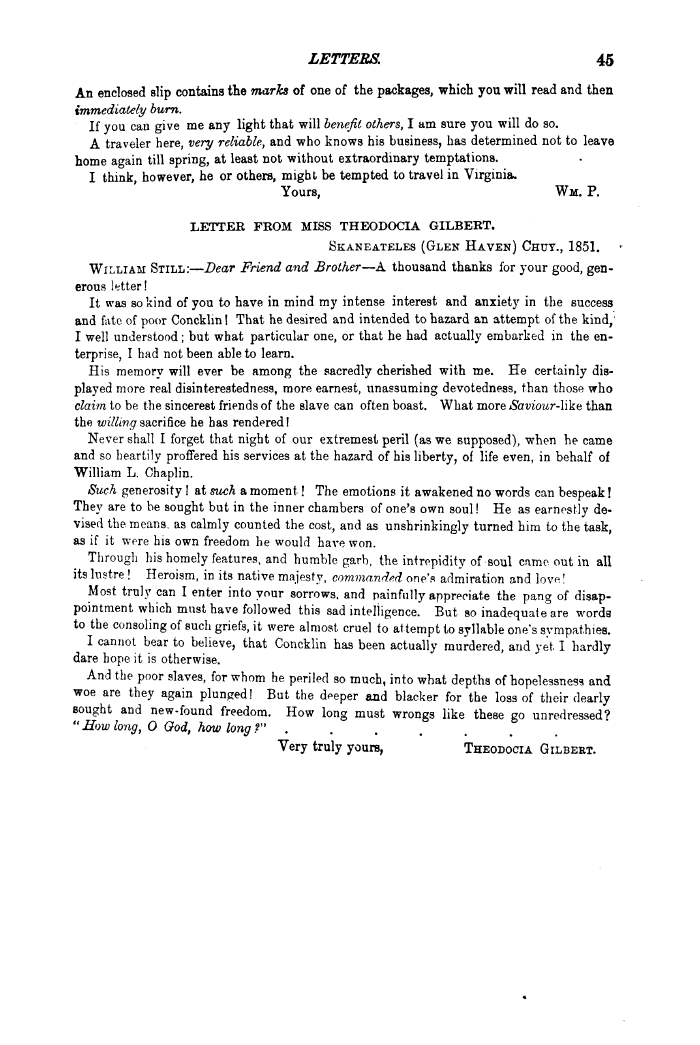 | LETTERS. 45 An enclosed slip contains the marks of one of the packages, which you will read and then immediately burn. If you can give me any light that will benefit others, I am sure you will do so. A traveler here, very reliable, and who knows his business, has determined not to leave home again till spring, at least not without extraordinary temptations. I think, however, he or others, might be tempted to travel in Virginia. Yours, WM. P. LETTER FROM MISS THEODOCTA GILBERT. SKANEATELES (GLEN HAVEN) CHUT., 1851. WILLIAM STILL:—Dear Friend and Brother—A thousand thanks for your good, generous letter! It was so kind of you to have in mind my intense interest and anxiety in the success and fate of poor Concklin! That he desired and intended to hazard an attempt of the kind,1 I well understood; but what particular one, or that he had actually embarked in the enterprise, I had not been able to learn. His memory will ever be among the sacredly cherished with me. He certainly displayed more real disinterestedness, more earnest, unassuming devotedness, than those who claim to be the sincerest friends of the slave can often boast. What more Saviour-like, than the willing sacrifice he has rendered! Never shall I forget that night of our extremes! peril (as we supposed), when he came and so heartily proffered his services at the hazard of his liberty, of life even, in behalf of William L. Chaplin. Such generosity ! at such a moment! The emotions it awakened no words can bespeak! They are to be sought but in the inner chambers of one's own soul! He as earnestly devised the means, as calmly counted the cost, and as unshrinkingly turned him to the task, as if it were his own freedom he would have won. Through his homely features, and humble garb, the intrepidity of-soul came out in all its lustre ! Heroism, in its native majesty, commanded one's admiration and love! Most truly can I enter into your sorrows, and painfully appreciate the pang of disappointment which must have followed this sad intelligence. But so inadequate are words to the consoling of such griefs, it were almost cruel to attempt to syllable one's sympathies. I cannot bear to believe, that Concklin has been actually murdered, and yet, I hardly dare hope it is otherwise. And the poor slaves, for whom he periled so much, into what depths of hopelessness and woe are they again plunged! But the deeper and blacker for the loss of their dearly sought and new-found freedom. How long must wrongs like these go unredressed? "How long, 0 God, how long?" ....... Very truly yours, THEODOCIA GILBERT. |