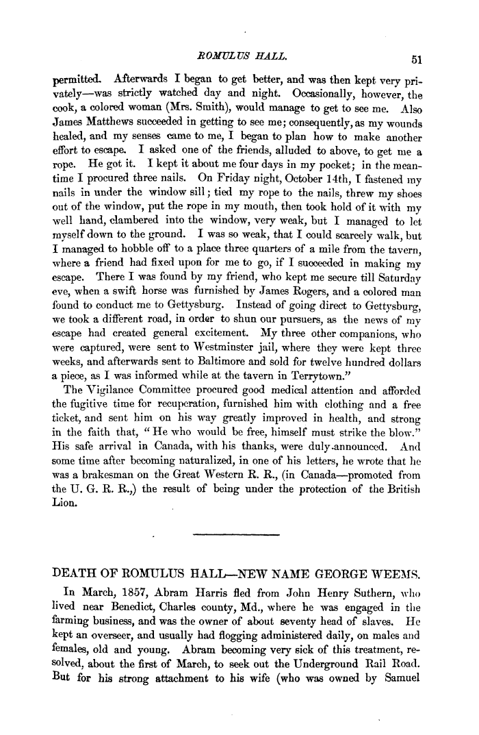 | ROMULUS HALL. 51 permitted. Afterwards I began to get better, and was then kept very privately—was strictly watched day and night. Occasionally, however, the cook, a colored woman (Mrs. Smith), would manage to get to see me. Also James Matthews succeeded in getting to see me; consequently, as my wounds healed, and my senses came to me, I began to plan how to make another effort to escape. I asked one of the friends, alluded to above, to get me a rope. He got it. I kept it about me four days in my pocket; in the meantime I procured three nails. On Friday night, October 14th, T fastened ray nails in under the window sill; tied my rope to the nails, threw my shoes out of the window, put the rope in my mouth, then took hold of it with my well hand, clambered into the window, very weak, but I managed to let myself down to the ground. I was so weak, that I could scarcely walk, but I managed to hobble off to a place three quarters of a mile from the tavern, where a friend had fixed upon for me to go, if I succeeded in making my escape. There I was found by my friend, who kept me secure till Saturday eve, when a swift horse was furnished by James Rogers, and a colored man found to conduct me to Gettysburg. Instead of going direct to Gettysburg, we took a different road, in order to shun our pursuers, as the news of my escape had created general excitement. My three other companions, who were captured, were sent to Westminster jail, where they were kept three weeks, and afterwards sent to Baltimore and sold for twelve hundred dollars a piece, as I was informed while at the tavern in Tenytown." The Vigilance Committee procured good medical attention and afforded the fugitive time for recuperation, furnished him with clothing and a free ticket, and sent him on his way greatly improved in health, and strong in the faith that, "He who would be free, himself must strike the blow." His safe arrival in Canada, with his thanks, were duly .announced. And some time after becoming naturalized, in one of his letters, he wrote that he was a brakesman on the Great Western R. R., (in Canada—promoted from the U. G. R. R.,) the result of being under the protection of the British Lion. DEATH OF ROMULUS HALL—NEW NAME GEORGE WEEMS. In March, 1857, Abram Harris fled from John Henry Suthern, \\-lio lived near Benedict, Charles county, Md., where he was engaged in the farming business, and was the owner of about seventy head of slaves. He kept an overseer, and usually had flogging administered daily, on males and females, old and young. Abram becoming very sick of this treatment, resolved, about the first of March, to seek out the Underground Rail Road. But for his strong attachment to his wife (who was owned by Samuel |