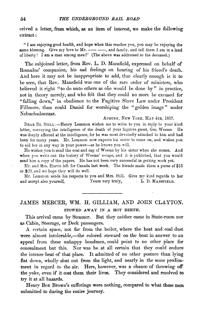 | 64 the UNDERGROUND RAIL ROAD ceived a letter, from which, as an item of interest, we make the following extract: " I am enjoying good health, and hope when this reaches you, you may be enjoying the same blessing. Give my love to Mr. —— ——, and family, and tell them I am in a land of liberty! I am a man among men!" (The above was addressed to the deceased.) The subjoined letter, from Rev. L. D. Mansfield, expressed on behalf of Romulus' companion, his sad feelings on hearing of his friend's death. And here it may not be inappropriate to add, that clearly enough is it to be seen, that Rev. Mansfield was one of the rare order of ministers, who believed it right "to do unto others as one would be done by" in practice, not in theory merely, and who felt that they could no more be excused for "falling down," in obedience to the Fugitive Slave Law under President Fillmore, than could Daniel for worshiping the "golden image" under Nebuchadnezzar. AUBTJEN, NEW YORK, MAY 4TH, 1857. DEAR BE. STILL :—Henry Lemmon wishes me to write to you in reply to your kind letter, conveying the intelligence of the death of your fugitive guest, Geo. Weems. He was deeply affected at the intelligence, for he was most devotedly attached to him and had been for many years. Mr. Lemmon now expects his sister to coine on, and wishes you to aid her in any way in your power—as he knows you will. He wishes you to send the coat and cap of Weems by his sister when she comes. And •when you write out the history of Weems' escape, and it is published, that you would send him a copy of the papers. He has not been very successful in getting work yet. Mr. and Mrs. Harris left for Canada last week. The friends made them a purse of $15 or $20, and we hope they will do well. Mr. Lemmon sends his respects to you and Mrs. Still. Give my kind regards to her and accept also yourself, Yours very truly, . L. D. MANSFIELD. JAMES MERCER, WM. H. GILLIAM, AND JOHN CLAYTOK STOWED AWAY IN A HOT BERTH. This arrival came by Steamer. But they neither came in State-room nor as Cabin, Steerage, or Deck passengers. A certain space, not far from the boiler, where the heat and coal dust were almost intolerable,—the colored steward on the boat in answer to an appeal from these unhappy bondmen, could point to no other place for concealment but this. Nor was he at all certain that they could endure the intense heat of that place. It admitted of no other posture than lying flat down, wholly shut out from the light, and nearly in the same predicament in regard to the air. Here, however, was a chance of throwing off the yoke, even if it cost them their lives. They considered and resolved to try it at all hazards. Henry Box Brown's sufferings were nothing, compared to what these men submitted to during the entire journey. |