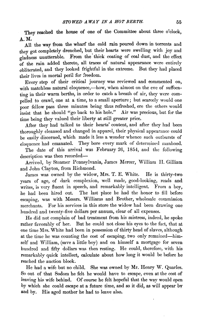 | STO WED AWAY IN A HOT BERTH. 55 They reached the house of one of the Committee about three o'clock, A.M. All the way from the wharf the cold rain poured down in torrents and they got completely drenched, but their hearts were swelling with joy and gladness unutterable. From the thick coating of coal dust, and the effect of the rain added thereto, all traces of natural appearance were entirely obliterated, and they looked frightful in the extreme. But they had placed their lives in mortal peril for freedom. Every step of their critical journey was reviewed and commented on, with matchless natural eloquence,—how, when almost on the eve of suffocating in their warm berths, in order to catch a breath of air, they were compelled to crawl, one at a time, to a small aperture; but scarcely would one poor fellow pass three minutes being thus refreshed, ere the others would insist that he should "go back to his hole." Air was precious, but for the time being they valued their liberty at still greater price. After they had talked to their hearts' content, and after they had been thoroughly cleansed and changed in apparel, their physical appearance could be easily discerned, which made it less a wonder whence such outbursts of eloquence had emanated. They bore every mark of determined manhood. The date of this arrival was February 26, 1854, and the following description was then recorded— Arrived, by Steamer Pennsylvania, James Mercer, William II. Gilliam and John Clay ton, from Richmond. James was owned by the widow, Mrs. T. E. White. He is thirty-two years of age, of dark complexion, well made, good-looking, reads and writes, is very fluent in speech, and remarkably intelligent. From a boy, he had been hired out. The last place he had the honor to fill before escaping, was with Messrs. Williams and Brother, wholesale commission merchants. For his services in this store the widow had been drawing: one O hundred and twenty-five dollars per annum, clear of all expenses. He did not complain of bad treatment from his mistress, indeed, he spoke rather favorably of her. But he could not close his eyes to the fact, that at one time Mrs. White had been in possession of thirty head of slaves, although at the time he was counting the cost of escaping, two only remained—himself and William, (save a little boy) and on himself a mortgage for seven hundred and fifty dollars was then resting. He could, therefore, with his remarkably quick intellect, calculate about how long it would be before he reached the auction block. He had a wife but no child. She was owned by Mr. Henry W. Quarles. So out of that Sodom he felt he would have to escape, even at the cost of leaving his wife behind. Of course he felt hopeful that the way would open by which she could escape at a future time, and so it did, as will appear by and by. His aged mother he had to leave also. |