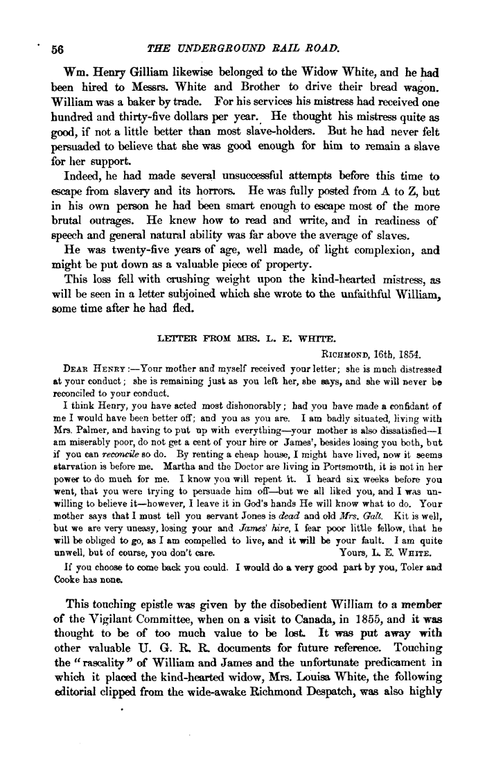 | 56 THE UNDERGROUND RAIL ROAD. Wm. Henry Gilliam likewise belonged to the Widow White, and he had been hired to Messrs. White and Brother to drive their bread wagon. William was a baker by trade. For his services his mistress had received one hundred and thirty-five dollars per year. He thought his mistress quite as good, if not a little better than most slave-holders. But he had never felt persuaded to believe that she was good enough for him to remain a slave for her support. Indeed, he had made several unsuccessful attempts before this time to escape from slavery and its horrors. He was fully posted from A to Z, but in his own person he had been smart enough to escape most of the more brutal outrages. He knew how to read and write, and in readiness of speech and general natural ability was far above the average of slaves. He was twenty-five years of age, well made, of light complexion, and might be put down as a valuable piece of property. This loss fell with crushing weight upon the kind-hearted mistress, as will be seen in a letter subjoined which she wrote to the unfaithful William, some time after he had fled. !LETTER FROM MKS. L. E. WHITE. RICHMOND, 16th, 1854. DEAR HENEY :—Yonr mother and myself received yoar letter; she is mnch distressed at your conduct; she is remaining just as you left her, she says, and she will never be reconciled to your conduct. I think Henry, you have acted most dishonorably; had you have made a confidant of me I would have been better off; and you as you are. I am badly situated, living with Mrs. Palmer, and having to put up with everything—your mother is also dissatisfied—I am miserably poor, do not get a cent of your hire or James', besides losing you both, but if you can reconcile so do. By renting a cheap house, I might have lived, now it seems starvation is before me. Martha and the Doctor are living in Portsmouth, it is not in her power to do much for me. I know you will repent it. I heard six weeks before you went, that you were trying to persuade him off—but we all liked you, and I WAS unwilling to believe it—however, I leave it in God's hands He will know what to do. Your mother says that I must tell you servant Jones is dead and old Mrs. Gait. Kit is well, but we are very uneasy, losing your and James' hire, I fear poor little fellow, that he will be obliged to go, as I am compelled to live, and it will be your fault. I am quite unwell, but of course, you don't care. Yours, L. E. WHITE. If you choose to come back you could. I would do a very good part by you, Toler and Cooke has none. This touching epistle was given by the disobedient William to a member of the Vigilant Committee, when on a visit to Canada, in 1855, and it was thought to be of too much value to be lost It was put away with other valuable U. G. R. R. documents for future reference. Touching the " rascality n of William and James and the unfortunate predicament in which it placed the kind-hearted widow, Mrs. Louisa White, the following editorial clipped from the wide-awake Richmond Despatch, was also highly |