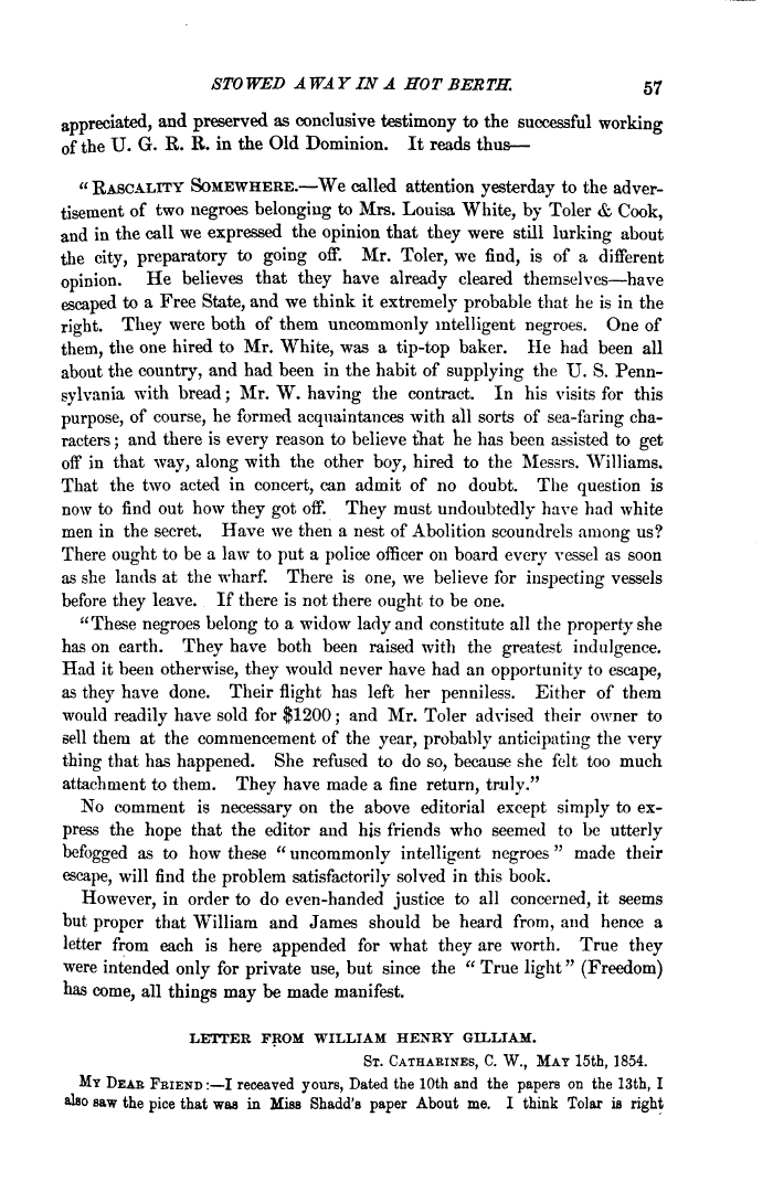 | STO WED AWAY IN A HOT BERTH. 57 appreciated, and preserved as conclusive testimony to the successful working of the U. G. R. R. in the Old Dominion. It reads thus— " RASCALITY SOMEWHERE.—We called attention yesterday to the advertisement of two negroes belonging to Mrs. Louisa White, by Toler & Cook, and in the call we expressed the opinion that they were still lurking about the city, preparatory to going off. Mr. Toler, we find, is of a different opinion. He believes that they have already cleared themselves—have escaped to a Free State, and we think it extremely probable that he is in the right. They were both of them uncommonly intelligent negroes. One of them, the one hired to Mr. White, was a tip-top baker. He had been all about the country, and had been in the habit of supplying the U. S. Pennsylvania with bread; Mr. W. having the contract. In his visits for this purpose, of course, he formed acquaintances with all sorts of sea-faring characters ; and there is every reason to believe that he has been assisted to get off in that way, along with the other boy, hired to the Messrs. Williams. That the two acted in concert, can admit of no doubt. The question is now to find out how they got off. They must undoubtedly have had white men in the secret. Have we then a nest of Abolition scoundrels among us? There ought to be a law to put a police officer on board every vessel as soon as she lands at the wharf. There is one, we believe for inspecting vessels before they leave. If there is not there ought to be one. "These negroes belong to a widow lady and constitute all the property she has on earth. They have both been raised with the greatest indulgence. Had it been otherwise, they would never have had an opportunity to escape, as they have done. Their flight has left her penniless. Either of them would readily have sold for $1200; and Mr. Toler advised their owner to sell them at the commencement of the year, probably anticipating the very thing that has happened. She refused to do so, because she felt too much attachment to them. They have made a fine return, truly." No comment is necessary on the above editorial except simply to express the hope that the editor and his friends who seemed to be utterly befogged as to how these " uncommonly intelligent negroes " made their escape, will find the problem satisfactorily solved in this book. However, in order to do even-handed justice to all concerned, it seems but proper that William and James should be heard from, and hence a letter from each is here appended for what they are worth. True they were intended only for private use, but since the " True light" (Freedom) has come, all things may be made manifest. LETTER FROM WILLIAM HENRY GILLIAM. ST. CATHARINES, C. W., MAY 15th, 1854. My DEAE FEIEND :—I receaved yours, Dated the 10th and the papers on the 13th, I also saw the pice that was in Miss Shadd's paper About me. I think Tolar IB right |