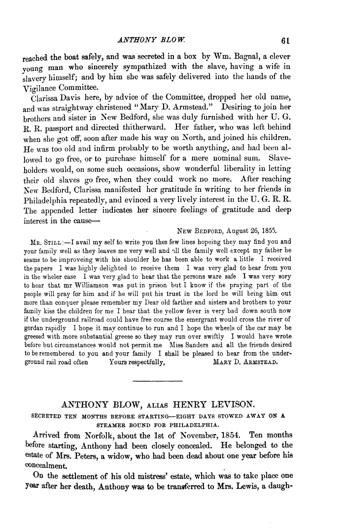 | ANTHONY BLOW. 61 reached the boat safely, and was secreted in a box by Win. Bagnal, a clever young man who sincerely sympathized with the slave, having a wife in slavery himself; and by him she was safely delivered into the hands of the Vigilance Committee. Clarissa Davis here, by advice of the Committee, dropped her old name, and was straightway christened " Mary D. Armstead." Desiring to join her brothers and sister in New Bedford, she was duly furnished with her U. G. K. Ii. passport and directed thitherward. Her father, who was left behind when she got oif, soon after made his way 011 North, and joined his children. He was too old and infirm probably to be worth anything, and had been allowed to go free, or to purchase himself for a mere nominal sum. Slaveholders would, on some such occasions, show wonderful liberality in letting their old slaves go free, when they could work no more. After reaching New Bedford, Clarissa manifested her gratitude in writing to her friends in Philadelphia repeatedly, and evinced a very lively interest in the U. G. R. R. The appended letter indicates her sincere feelings of gratitude and deep interest in the cause— NEW BEDFORD, August 26, 1855. ME. STILL:—I avail my self to write you thes few lines hopeing they may find you and your family well as they leaves me very well and ill the family well except my father he seams to be irnproveing with his shoulder he has been able to work a little I received the papers I was highly delighted to receive them I was very glad to hear from you in the wheler case I was very glad to hear that the persons ware safe I was very sory to hear that mr Williamson was put in prison but I know if the praying part of the people will pray for him and if he will put his trust in the lord he will bring him out more than conquer please remember my Dear old farther and sisters and brothers to your family kiss the children for me I hear that the yellow fever is very bad down south now if the underground railroad could have free course the emergrant would cross the river of gordan rapidly I hope it may continue to run and I hope the wheels of the car may be greesed with more substantial greese so they may run over swiftly I would have wrote before but circumstances would not permit me Miss Sanders and all the friends desired to be remembered to you and your family I shall be pleased to hear from the underground rail road often Yours respectfully, MARY D. ARMSTEAD. ANTHONY BLOW, ALIAS HENRY LEVISON. SECRETED TEN MONTHS BEFORE STARTING—EIGHT DAYS STOWED AWAY ON A STEAMER BOUND FOR PHILADELPHIA. Arrived from Norfolk, about the 1st of November, 1854. Ten months before starting, Anthony had been closely concealed. He belonged to the estate of Mrs. Peters, a widow, who had been dead about one year before his concealment. On the settlement of his old mistress* estate, which was to take place one year after her death, Anthony was to be transferred to Mrs. Lewis, a daugh- |