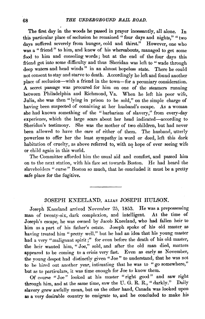 | 68 THE UNDERGROUND RAIL ROAD. The first day in the woods he passed in prayer incessantly, all alone. In this particular place of seclusion he remained " four days and nights," " two days suffered severely from hunger, cold and thirst." However, one who was a " friend " to him, and knew of his whereabouts, managed to get some food to him and consoling words; but at the end of the four days this friend got into some difficulty and thus Sheridan was left to " wade through deep waters and head winds " in an almost hopeless state. There he could not consent to stay and starve to death. Accordingly he left and found another place of seclusion—with a friend in the town—for a pecuniary consideration. A secret passage was procured for him on one of the steamers running between Philadelphia and Richmond, Va. When he left his poor wife, Julia, she was then " lying in prison to be sold," on the simple charge of having been suspected of conniving at her husband's escape. As a woman she had known something of the " barbarism of slavery/' from every-day experience, which the large scars about her head indicated—according to Sheridan's testimony. She was the mother of two children, but had never been allowed to have the care of either of them. The husband, utterly powerless to offer her the least sympathy in word or deed, left this dark habitation of cruelty, as above referred to, with no hope of ever seeing wife or child again in this world. The Committee afforded him the usual aid and comfort, and passed him on to the next station, with his face set towards Boston. He had heard the slaveholders " curse " Boston so much, that he concluded it must be a pretty safe place for the fugitive. JOSEPH KNEELAND, ALIAS JOSEPH HULSON. Joseph Kneeland arrived November 25, 1853. He was a prepossessing man of twenty-six, dark complexion, and intelligent. At the time of Joseph's escape, he was owned by Jacob Kneeland, who had fallen heir to him as a part of his father's estate. Joseph spoke of his old master as having treated him " pretty well," but lie had an idea that his young master had a very "malignant spirit;" for even before the death of his old master, the heir wanted him, " Joe," sold, and after the old man died, matters appeared to be coming to a crisis very fast. Even as early as November, the young despot had distinctly given "Joe" to understand, that he was not to be hired out another year, intimating that he was to " go somewhere," but as to particulars, it was time enough for Joe to know them. Of course " Joe" looked at his master " right good" and saw right through him, and at the same time, saw the U. G. R. R., " darkly." Daily slavery grew awfully mean, but on the other hand, Canada was looked upon as a very desirable country to emigrate to, and he concluded to make his |