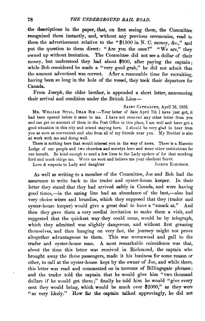 | 78 THE UNDERGROUND RAIL ROAD. the descriptions in the paper, that, on first seeing them, the Committee recognized them instantly, and, without any previous ceremonies, read to them the advertisement relative to the " $1500 in N. C. money, &c." aoid put the question to them direct: "Are you the ones?" "We are," they owned up without hesitation. The Committee did not see a dollar of their money, but understood they had about $900, after paying the captain; while Bob considered he made a "very good grab," he did not admit that the amount advertised was correct. After a reasonable time for recruiting, having been so long in the hole of the vessel, they took their departure for Canada. From Joseph, the elder brother, is appended a short letter, announcing their arrival and condition under the British Lion— SAINT CATHARINE, April 16, 1855. MB. WILLIAM STILL, DEAE SIB :—Your letter of date April 7th I have just got, it had been opened before it came to me. I have not received any other letter from you and can get no account of them in the Post Office in this place, I am well and have got a good situation in this city and intend staying here. I should be very glad to hear from you as soon as convenient and also from all of my friends near you. My Brother is also at work with me and doing well. There is nothing here that would interest you in the way of news. There is a Masonic Lodge of our people and two churches and societys here and some other institutions for our benefit. Be kind enough to send a few lines to the Lady spoken of for that mocking bird and much oblige me. Write me soon and believe me your obedient Servt Love & respects to Lady and daughter JOSEPH ROBINSON. As well as writing to a member of the Committee, Joe and Bob had the assurance to write back to the trader and oyster-house keeper. In their letter they stated that they had arrived safely in Canada, and were having good times,—in the eating line had an abundance of the best,—also had very choice wines and brandies, which they supposed that they (trader aiid oyster-house keeper) would give a great deal to have a "smack at." And then they gave them a very cordial invitation to make them a visit, and suggested that the quickest way they could come, would be by telegraph, which they admitted was slightly dangerous, and without first greasing themselves, and then hanging on very fast, the journey might not prove altogether advantageous to them. This was wormwood and gall to the trader and oyster-house man. A most remarkable coincidence was that, about the time this letter was received in Richmond, the captain who brought away the three passengers, made it his business for some reason or other, to call at the oyster-house kept by the owner of Joe, and while there, this letter was read and commented on in torrents of Billingsgate phrases; and the trader told the captain that he would give him " two thousand dollars if he would get them;" finally he told him he would "give every cent they would bring, which would be much over $2000," as they were "so very likely." How for the captain talked approvingly, he did not |