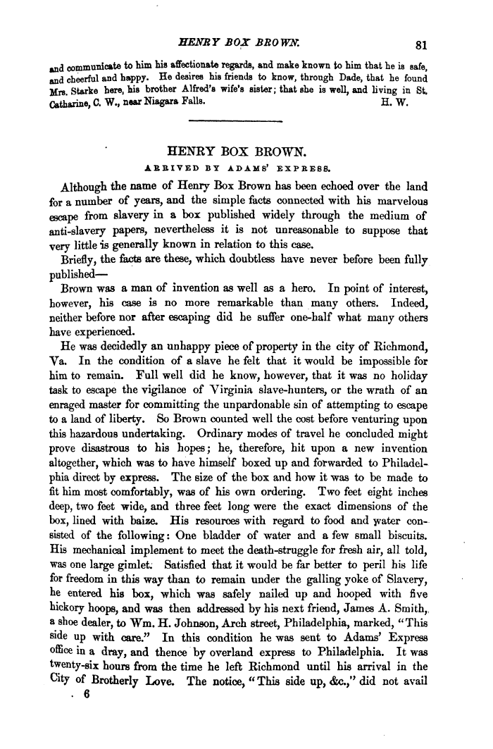 Although the name of Henry Box Brown has been echoed over the land for a number of years, and the simple facts connected with his marvelous escape from slavery in a box published widely through the medium of anti-slavery papers, nevertheless it is not unreasonable to suppose that very little is generally known in relation to this case.