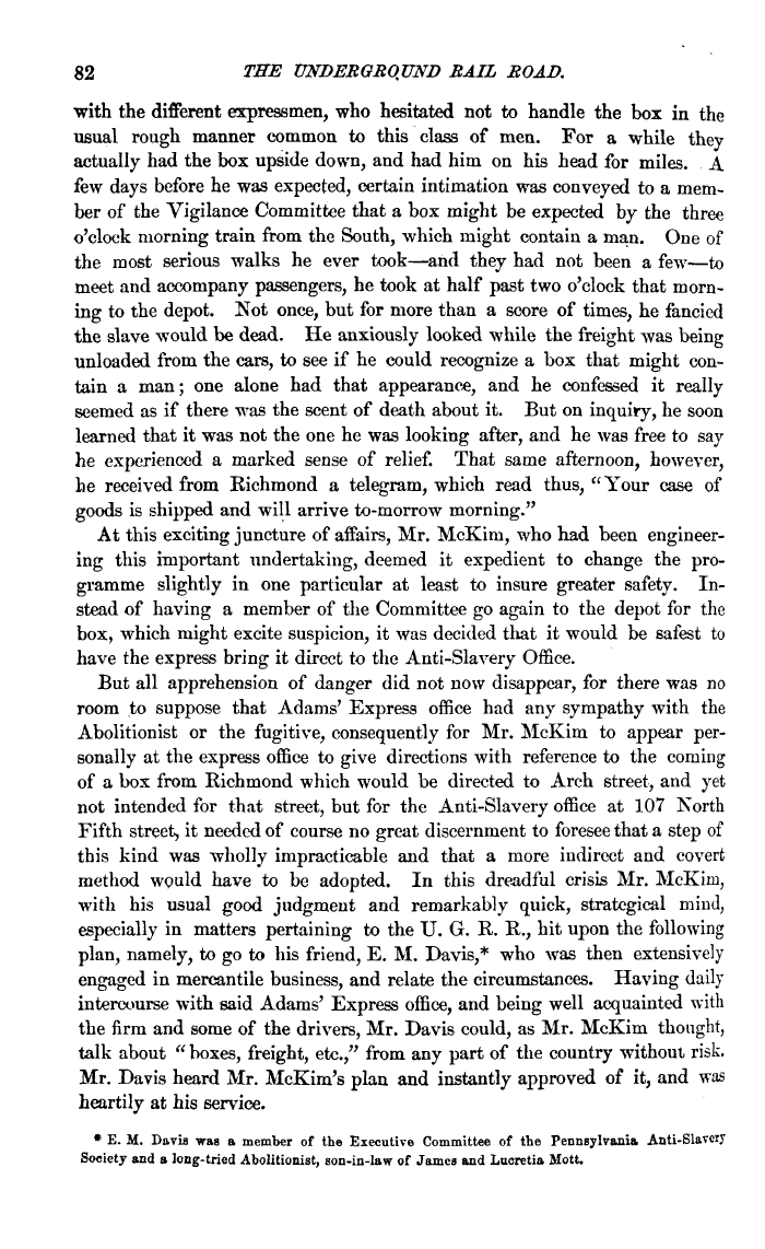| 82 THE UNDERGROUND RAIL ROAD. with the different expressmen, who hesitated not to handle the box in the usual rough manner common to this class of men. For a while they actually had the box upside down, and had him on his head for miles. A few days before he was expected, certain intimation was conveyed to a member of the Vigilance Committee that a box might be expected by the three o'clock morning train from the South, which might contain a man. One of the most serious walks he ever took—and they had not been a few—to meet and accompany passengers, he took at half past two o'clock that morning to the depot. Not once, but for more than a score of times, he fancied the slave would be dead. He anxiously looked while the freight was being unloaded from the cars, to see if he could recognize a box that might contain a man; one alone had that appearance, and he confessed it really seemed as if there was the scent of death about it. But on inquiry, he soon learned that it was not the one he was looking after, and he was free to say he experienced a marked sense of relief. That same afternoon, however, he received from Richmond a telegram, which read thus, " Your case of goods is shipped and will arrive to-morrow morning." At this exciting juncture of affairs, Mr. McKira, who had been engineering this important undertaking, deemed it expedient to change the programme slightly in one particular at least to insure greater safety. Instead of having a member of the Committee go again to the depot for the box, which might excite suspicion, it was decided that it would be safest to have the express bring it direct to the Anti-Slavery Office. But all apprehension of danger did not now disappear, for there was no room to suppose that Adams' Express office had any sympathy with the Abolitionist or the fugitive, consequently for Mr. McKim to appear personally at the express office to give directions with reference to the coming of a box from Richmond which would be directed to Arch street, and yet not intended for that street, but for the Anti-Slavery office at 107 North Fifth street, it needed of course no great discernment to foresee that a step of this kind was wholly impracticable and that a more indirect and covert method would have to be adopted. In this dreadful crisis Mr. McKim, with his usual good judgment and remarkably quick, strategical mind, especially in matters pertaining to the U. G. R. R., hit upon the following plan, namely, to go to his friend, E. M. Davis,* who was then extensively engaged in mercantile business, and relate the circumstances. Having daily intercourse with said Adams' Express office, and being well acquainted with the firm and some of the drivers, Mr. Davis could, as Mr. McKim thought, talk about " boxes, freight, etc.," from any part of the country without risk. Mr. Davis heard Mr. McKim's plan and instantly approved of it, and was heartily at his service. * E. M. Davis was a member of the Executive Committee of the Pennsylvania Anti-Slavery Society and a long-tried Abolitionist, son-in-law of Jamea and Lucretia Mott. |