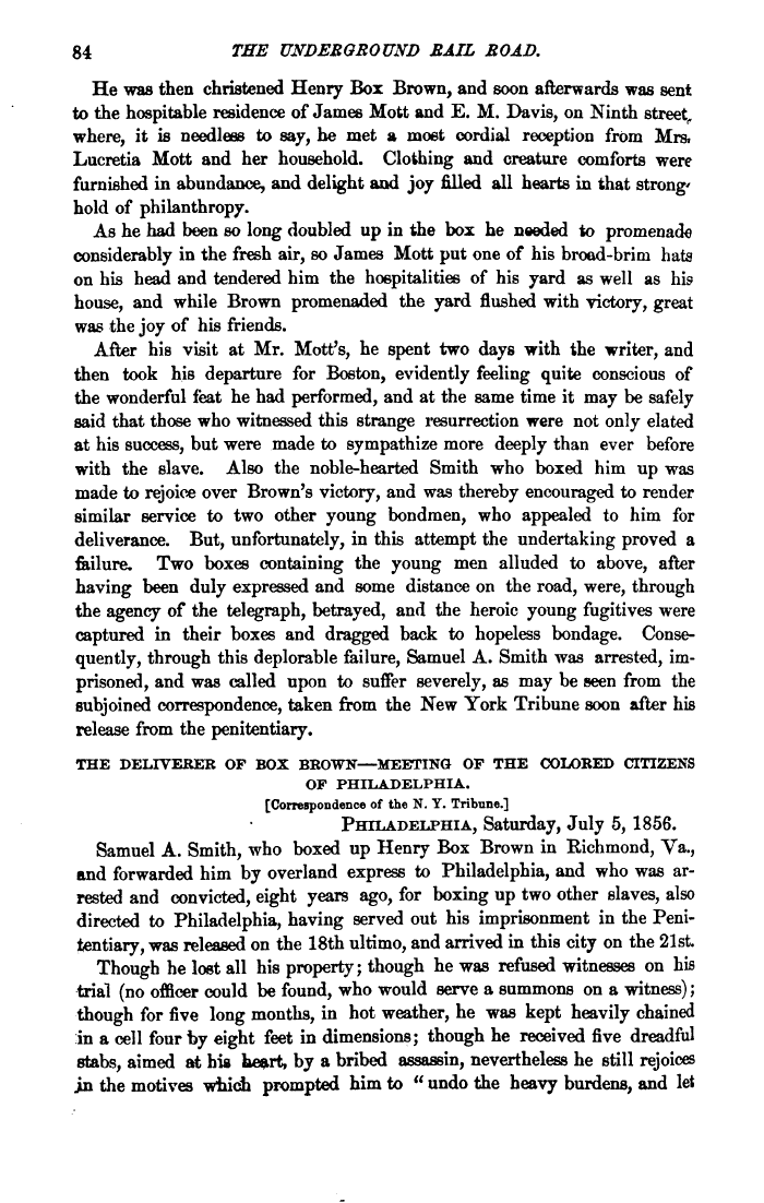 | 84 THE UNDERGROUND RAIL ROAD. He was then christened Henry Box Brown, and soon afterwards was sent to the hospitable residence of James Mott and E. M. Davis, on Ninth street,. where, it is needless to say, he met a moet cordial reception from Mrs, Lucretia Mott and her household. Clothing and creature comforts were furnished in abundance, and delight and joy filled all hearts in that strong' hold of philanthropy. As he had been so long doubled up in the box he needed to promenade considerably in the fresh air, so James Mott put one of his broad-brim hats on his head and tendered him the hospitalities of his yard as well as his house, and while Brown promenaded the yard flushed with victory, great was the joy of his friends. After his visit at Mr. Mott's, he spent two days with the writer, and then took his departure for Boston, evidently feeling quite conscious of the wonderful feat he had performed, and at the same time it may be safely said that those who witnessed this strange resurrection were not only elated at his success, but were made to sympathize more deeply than ever before with the slave. Also the noble-hearted Smith who boxed him up was made to rejoice over Brown's victory, and was thereby encouraged to render similar service to two other young bondmen, who appealed to him for deliverance. But, unfortunately, in this attempt the undertaking proved a failure. Two boxes containing the young men alluded to above, after having been duly expressed and some distance on the road, were, through the agency of the telegraph, betrayed, and the heroic young fugitives were captured in their boxes and dragged back to hopeless bondage. Consequently, through this deplorable feilure, Samuel A. Smith was arrested, imprisoned, and was called upon to suffer severely, as may be seen from the subjoined correspondence, taken from the New York Tribune soon after his release from the penitentiary. THE DELIVERER OF BOX BROWN—MEETING OF THE COLORED CITIZENS OF PHILADELPHIA. [Correspondence of the N. Y. Tribune.] PHILADELPHIA, Saturday, July 5, 1856. Samuel A. Smith, who boxed up Henry Box Brown in Richmond, Va., and forwarded him by overland express to Philadelphia, and who was arrested and convicted, eight years ago, for boxing up two other slaves, also directed to Philadelphia, having served out his imprisonment in the Penitentiary, was released on the 18th ultimo, and arrived in this city on the 21st. Though he lost all his property; though he was refused witnesses on his trial (no officer could be found, who would serve a summons on a witness); though for five long months, in hot weather, he was kept heavily chained in a cell four by eight feet in dimensions; though he received five dreadful stabs, aimed at his heart, by a bribed assassin, nevertheless he still rejoices in the motives which prompted him to " undo the heavy burdens, and let |