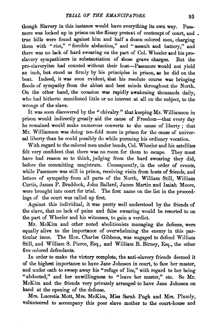 | TRIAL OF THE EMANCIPATORS. 93 though Slavery in this instance would have everything its own way. Pass-more was locked up in prison on the flimsy pretext of contempt of court, and , true bills were found against him and half a dozen colored men, charging them with "riot," "forcible abduction," and "assault and battery/' and there was no lack of hard swearing on the part of Col. Wheeler and his pro-slavery sympathizers in substantiation of these grave charges. But the pro-slaveryites had counted without their host—Passmore would not yield an inch, but stood as firmly by his principles in prison, as he did on the boat. Indeed, it was soon evident, that his resolute course was briuging floods of sympathy from the ablest and best minds throughout the North. On the other hand, the occasion \ras rapidly avrakeuing thousands daily, who had hitherto manifested little or no interest at all on the subject, to the wrongs of the slave. It was soon discovered by the " chivalry " that keeping Mr. Williamson in prison would indirectly greatly aid the cause of Freedom—that every day he remained would make numerous converts to the cause of liberty ; that Mr. Williamson was doing ten-fold more in prison for the cause of universal liberty than he could possibly do while pursuing his ordinary vocation. With regard to the colored men under bonds, Col. Wheeler and his satellites felt very confident that there was no room for them to escape. They must have had reason so to think, judging from the hard swearing they did, before the committing magistrate. Consequently, in the order of events, while Passmore was still in prison, receiving visits from hosts of friends, and letters of sympathy from all parts of the North, William Still, William Curtis, James P. Braddock, John Ballard, James Martin and Isaiah Moore, were brought into court for trial. The first name on the list ID the proceedings of the court was called up first. Against this individual, it was pretty well understood by the friends of the slave, that no lack of pains and false swearing would be resorted to on the part of Wheeler and his witnesses, to gain a verdict. Mr. McKim and other noted abolitionists managing the defense, were equally alive to the importance of overwhelming the enemy in this particular issue. The Hon. Charles Gibbons, was engaged to defend William Still, and William S. Pierce, Esq., and William B. Birney, Esq., the other five colored defendants. In order to make the victory complete, the anti-slavery friends deemed it of the highest importance to have Jane Johnson in court, to face her master, and under oath to sweep away his "refuge of lies/' with regard to her being "abducted/* and her unwillingness to "leave her master," etc. So Mr. McKim and the friends very privately arranged to have Jane Johnson on hand at the opening of the defense. Mrs. Lucretia Mott, Mrs. McKim, Miss Sarah Pugh and Mrs. Plumly, volunteered to accompany this poor slave mother to the court-house and |